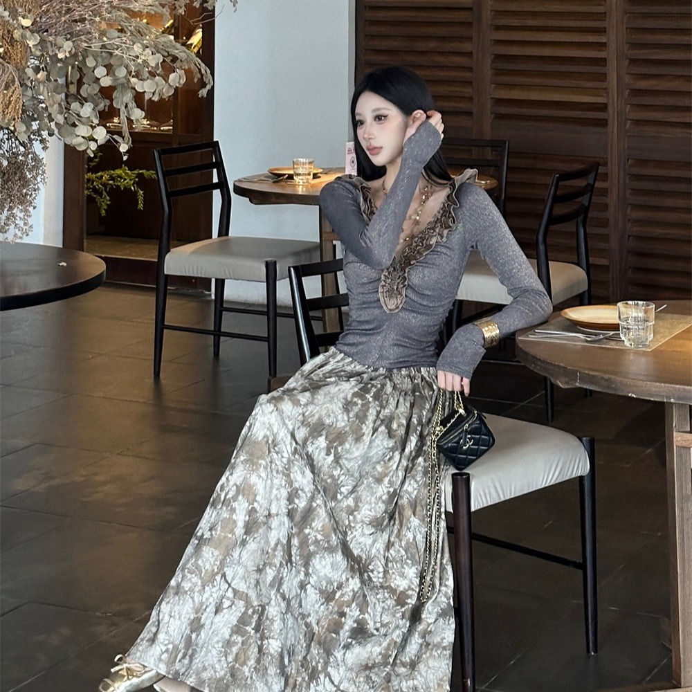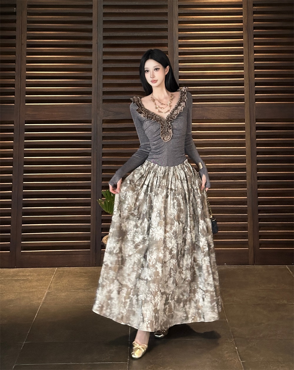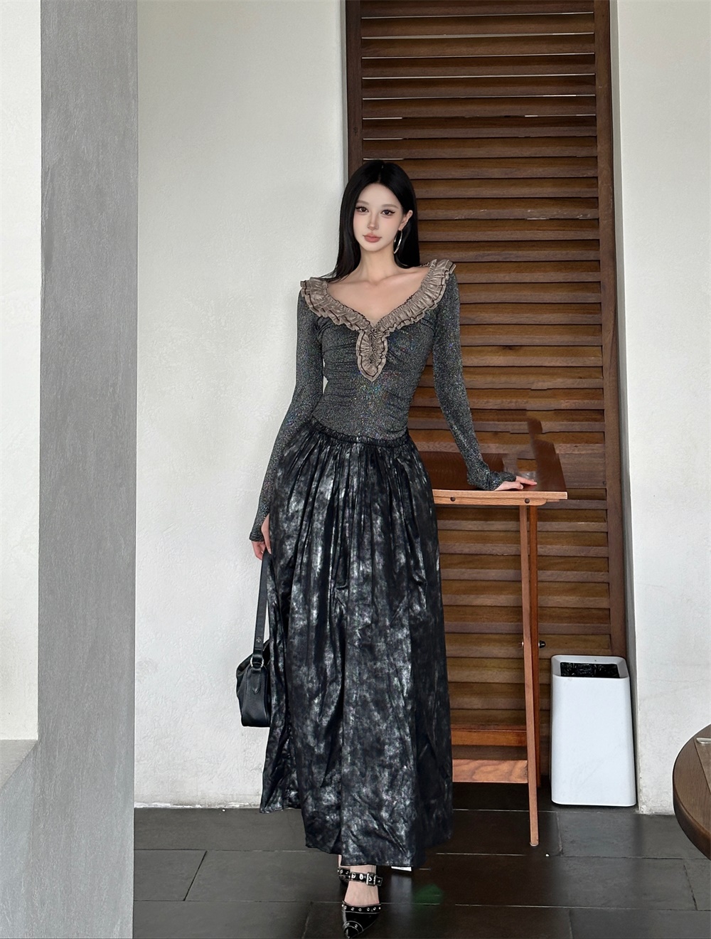 FA48934# 重磅细闪针织拼皮V领显瘦复古长连衣裙冬 服裝批發女裝批發服飾貨源