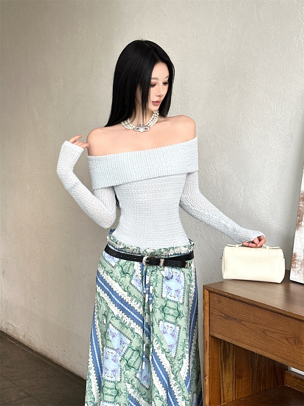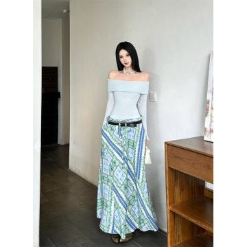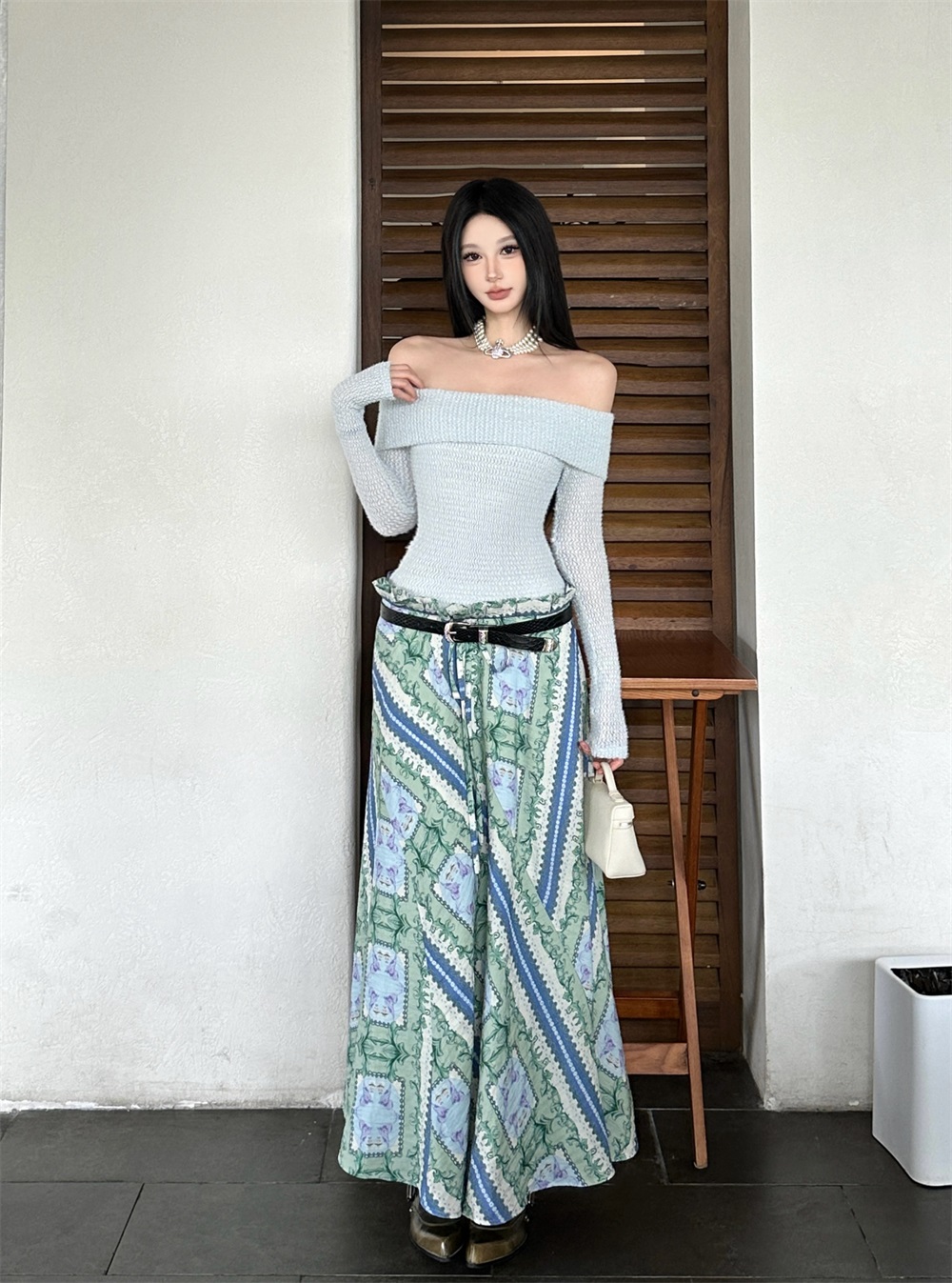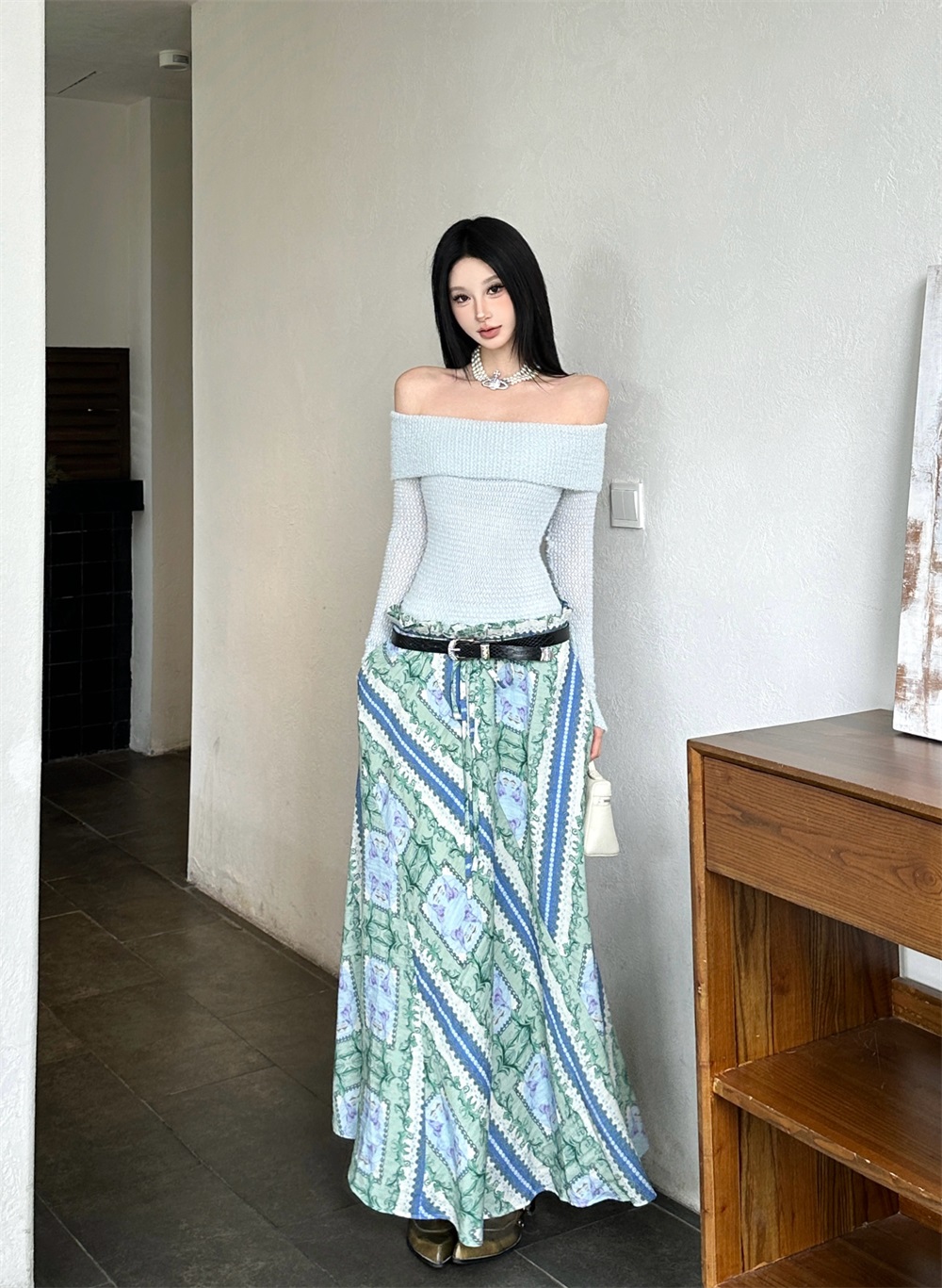 FA48936# 利兹与幻想原创法式一字肩针织拼接艺术印花大摆连衣裙 服裝批發女裝批發服飾貨源