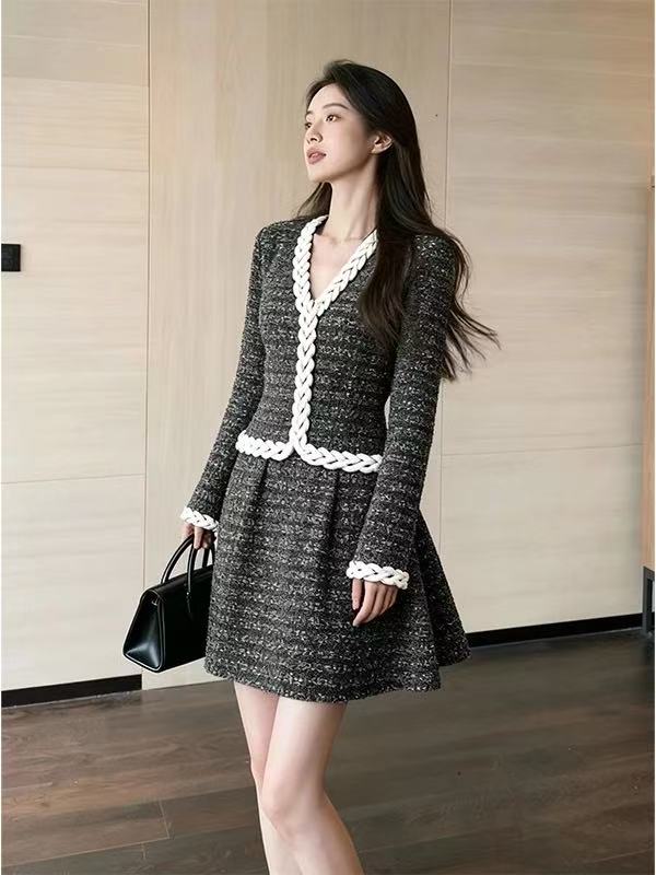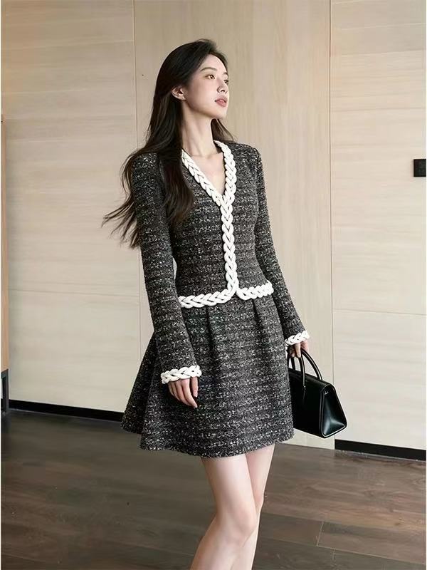 FA48971# 富家千金miu系穿搭年会礼服灰色编织粗花呢小香风连衣裙子女秋冬 服裝批發女裝批發服飾貨源