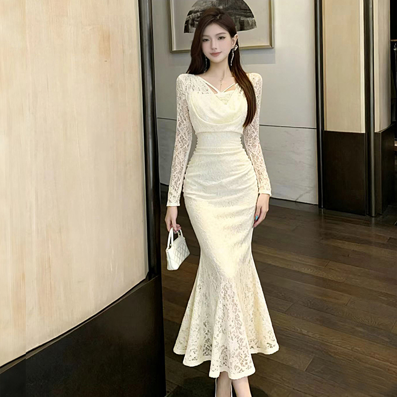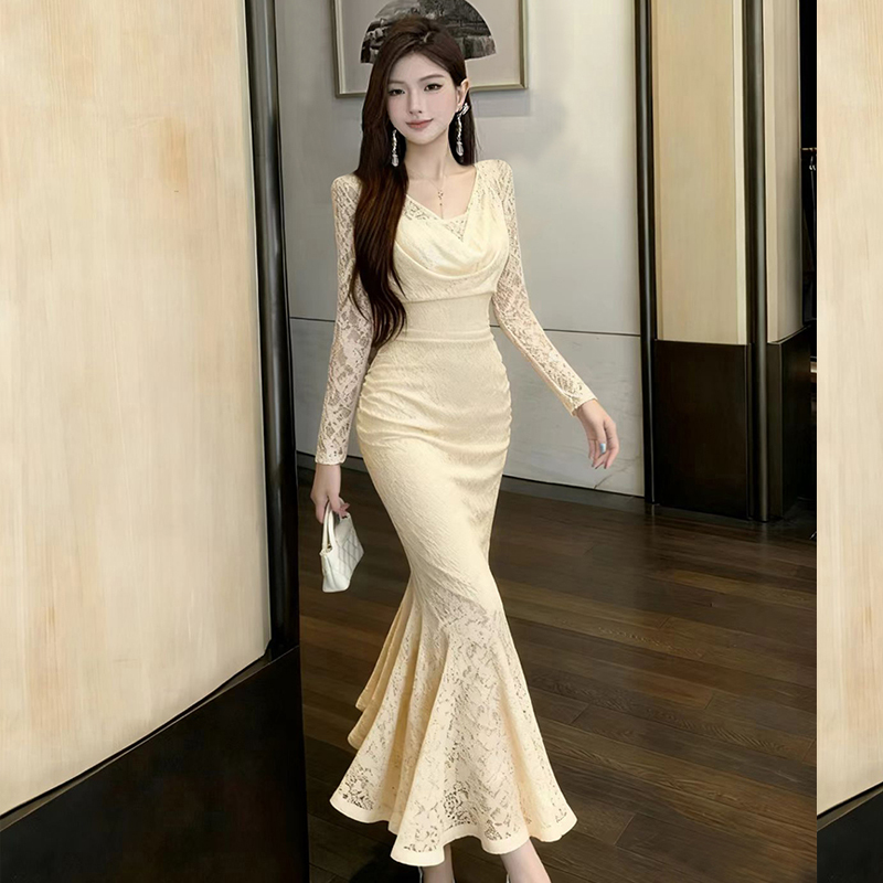 FA48976# 新款爆版长袖性感V领打底包臀蕾丝长款连衣裙 服裝批發女裝批發服飾貨源