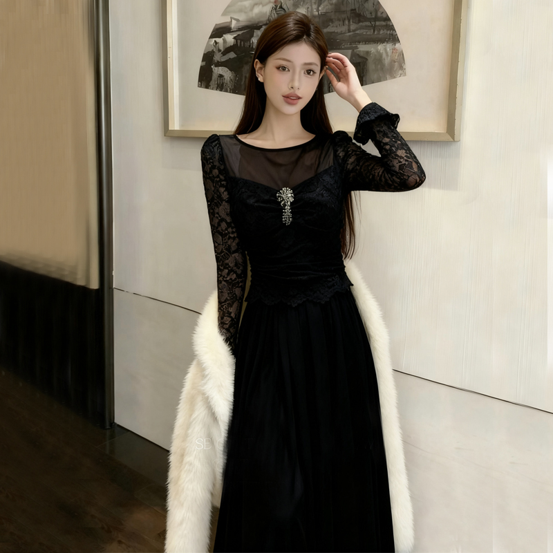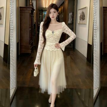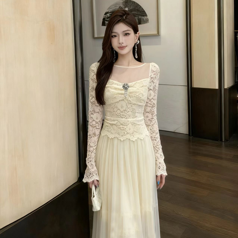 FA48977# 新款高感级性感显瘦打底长袖蕾丝荷叶边网纱拼接连衣裙 服裝批發女裝批發服飾貨源
