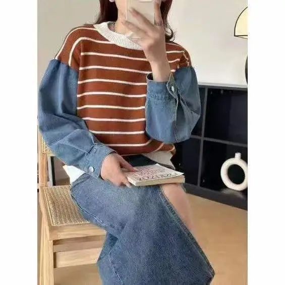 FA49008# 春秋爆款假两件毛衣条纹衫牛仔拼接宽松休闲针织上衣女小个子卫衣 服裝批發女裝批發服飾貨源