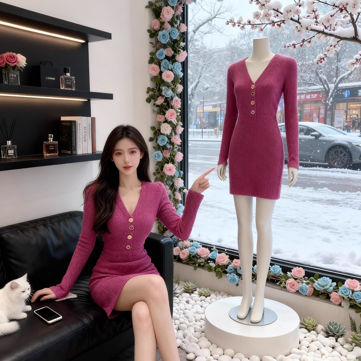 FA49103# 性感V领排扣针织连衣裙女秋冬新款加厚修身显瘦短裙约会裙子 服裝批發女裝批發服飾貨源
