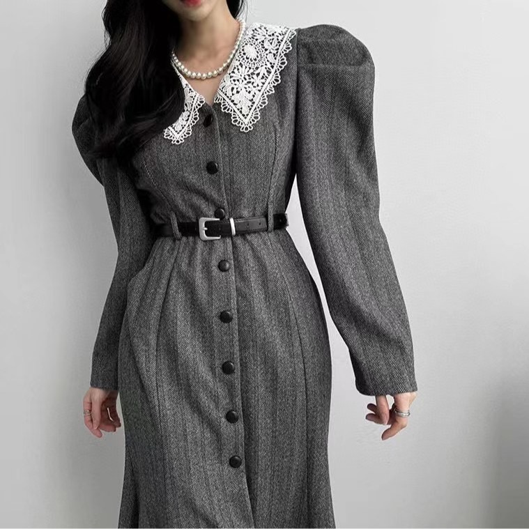 FA49117# 法式气质花边荷叶领西装式外套收腰连衣裙配皮带 服裝批發女裝批發服飾貨源
