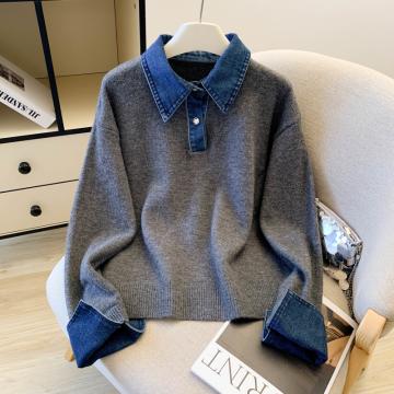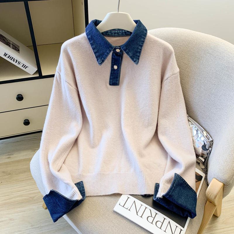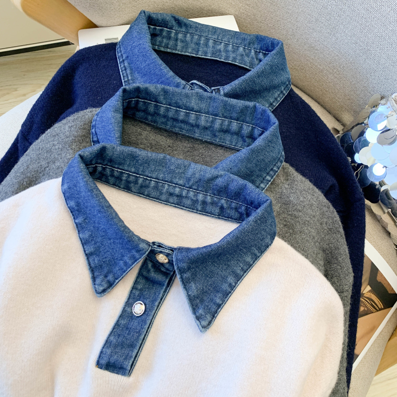 FA49205# 假两件设计感小众加厚牛仔领polo撞色毛衣女针织衫宽松上衣 服裝批發女裝批發服飾貨源