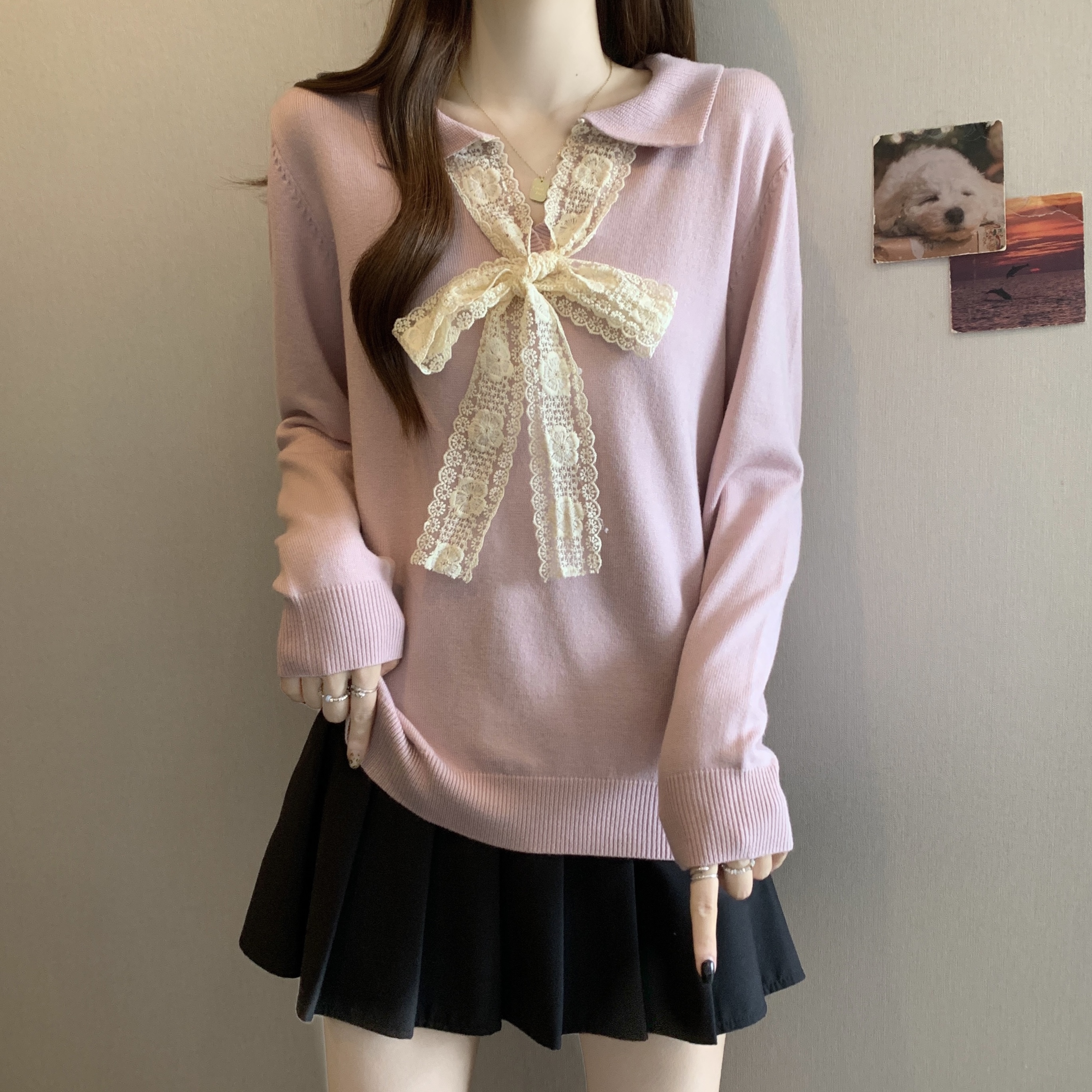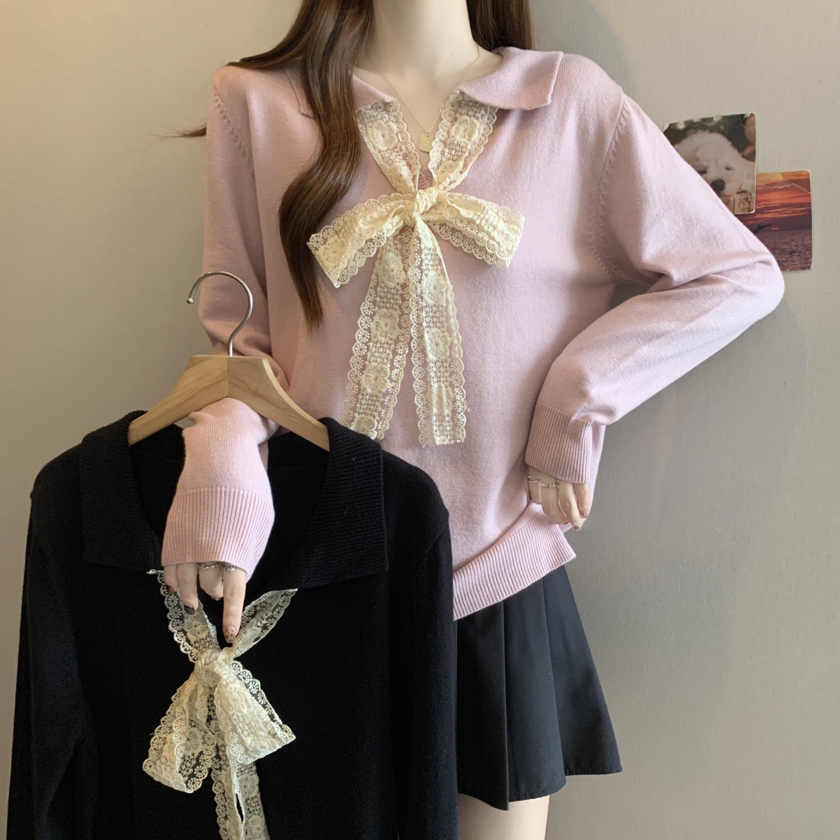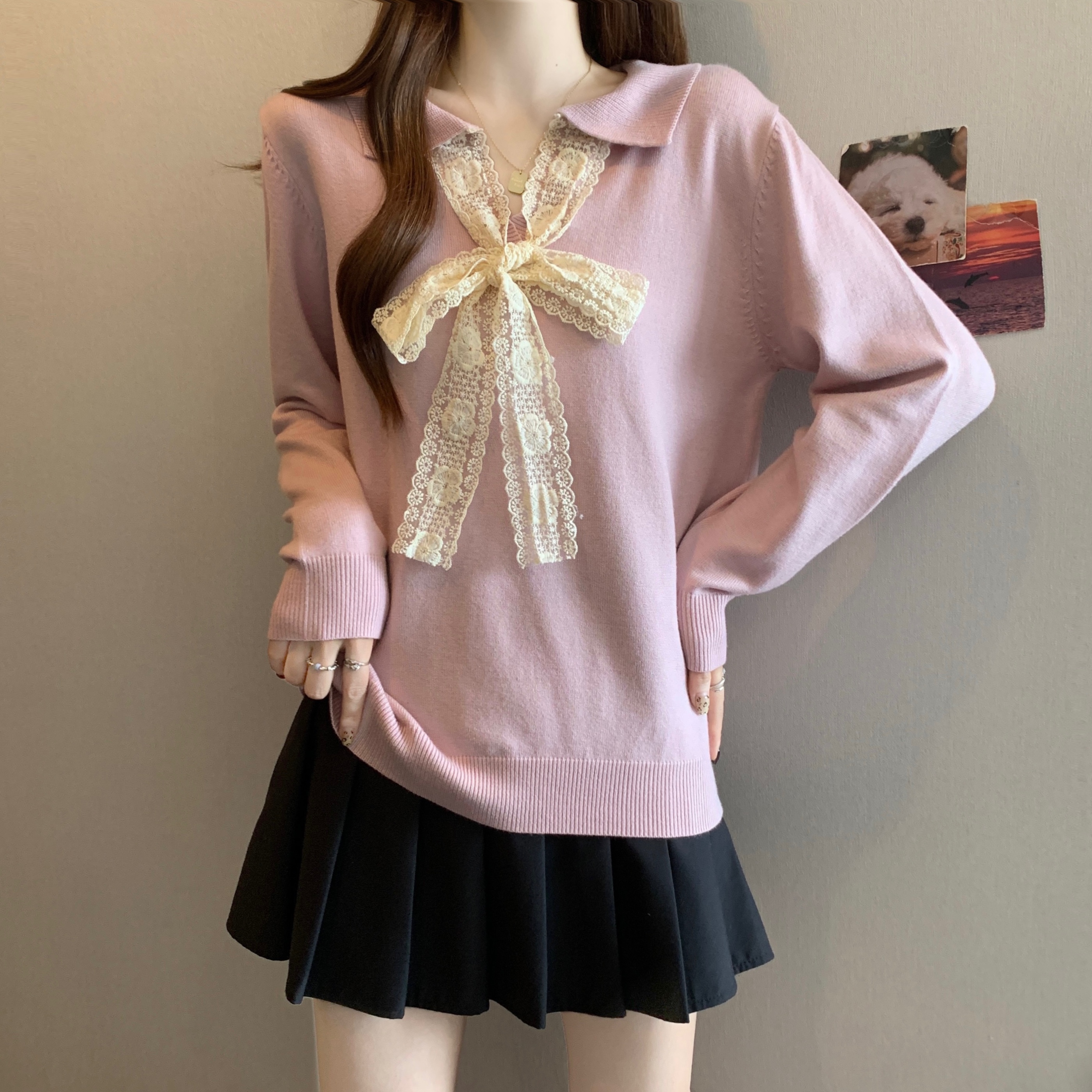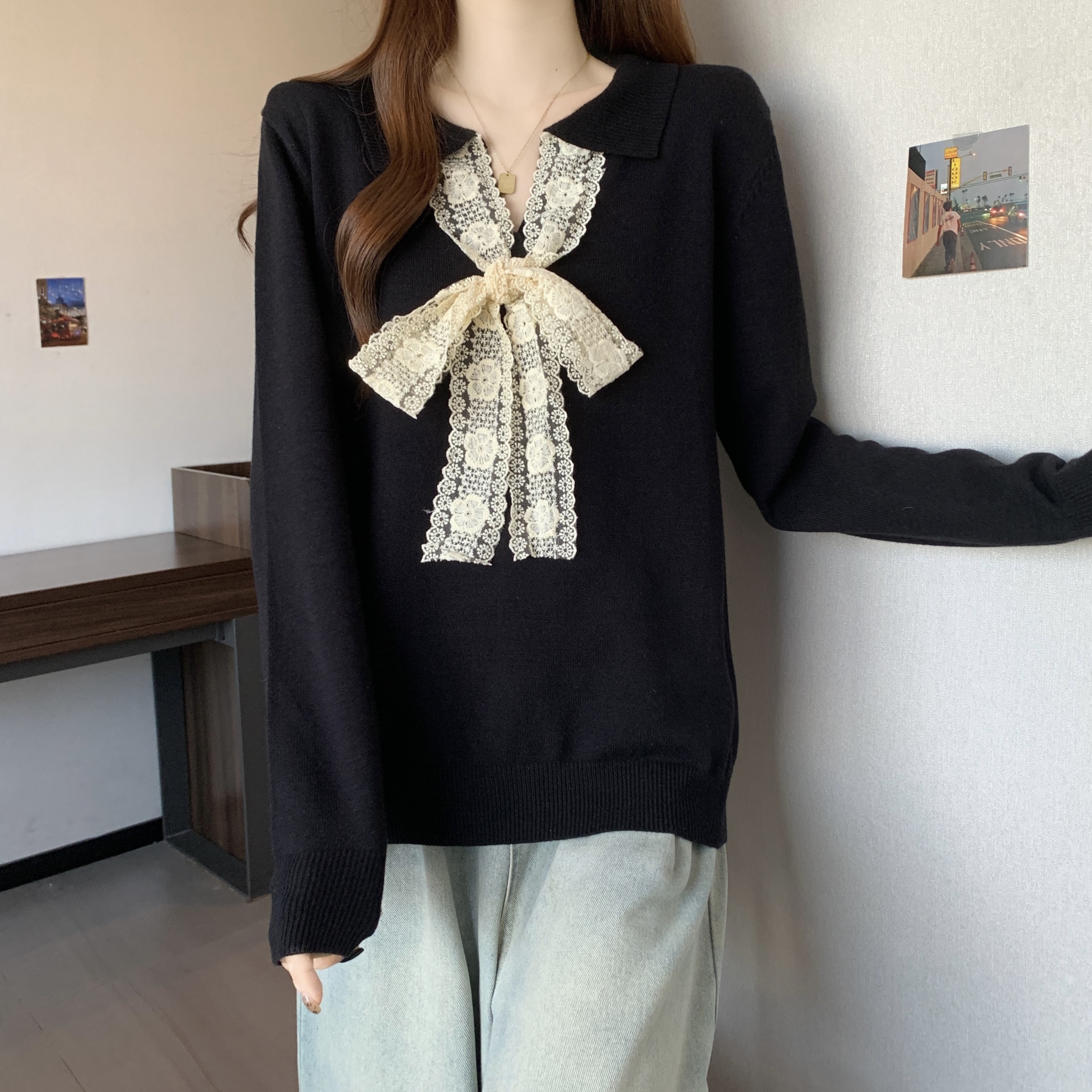 FA49224# 蕾丝拼接娃娃领长袖针织衫秋冬大码女装微胖mm宽松内搭毛衣 服裝批發女裝批發服飾貨源