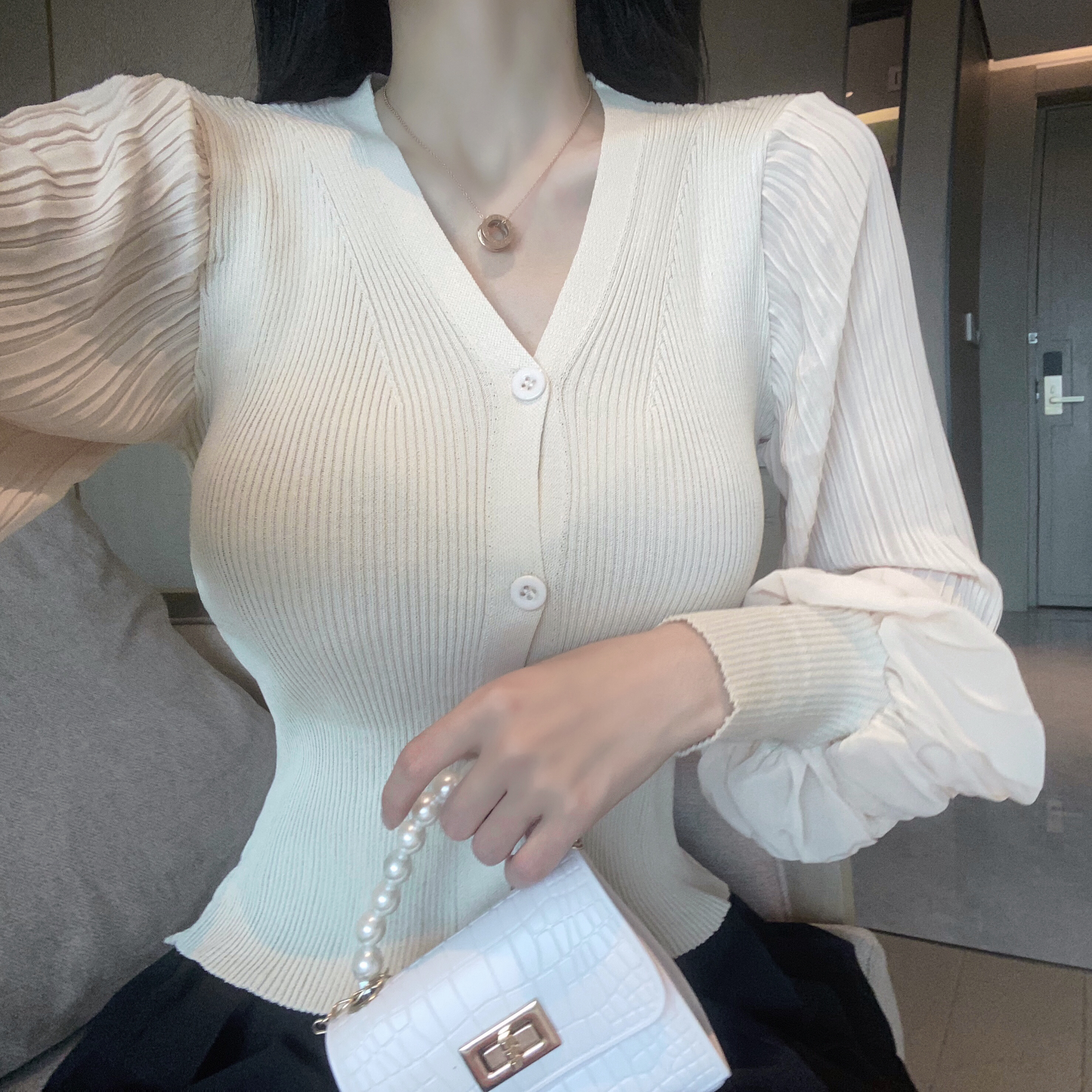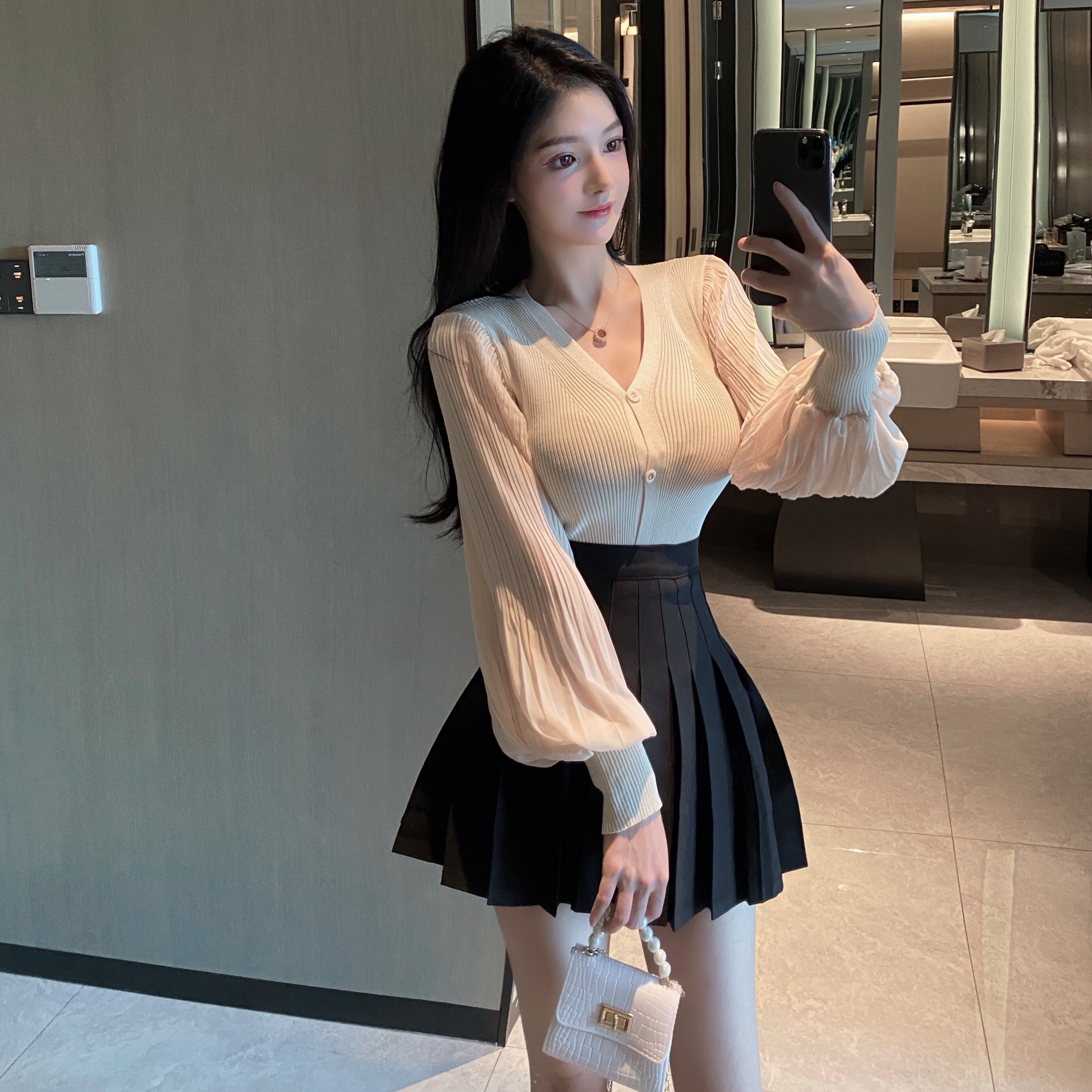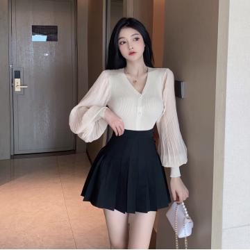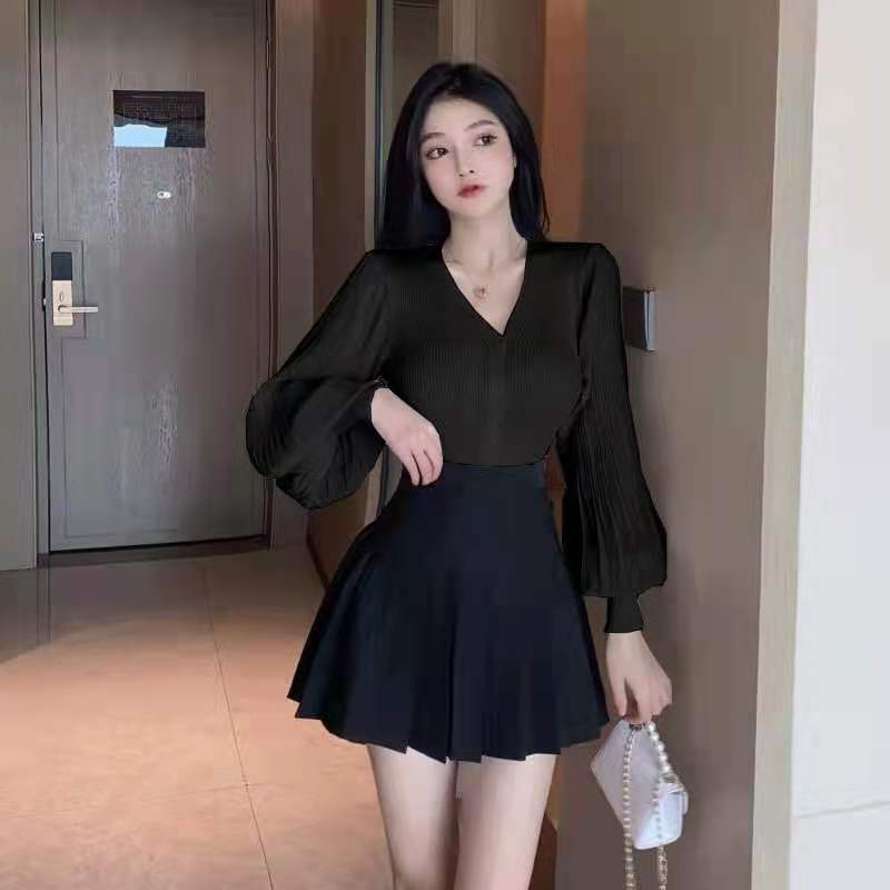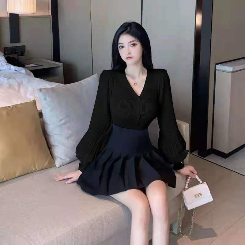 新款灯笼袖薄款针织衫上衣+黑色百褶裙