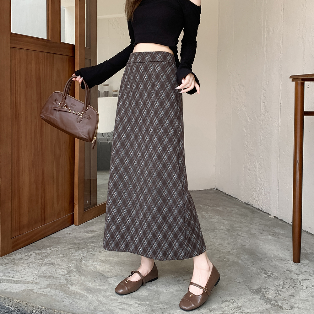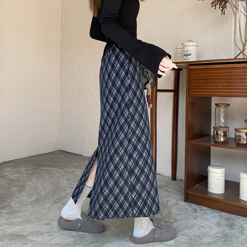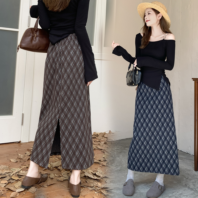 FA49770# 复古格子开叉直筒裙秋冬新款高腰显瘦遮胯百搭中长裙包臀裙 服裝批發女裝批發服飾貨源