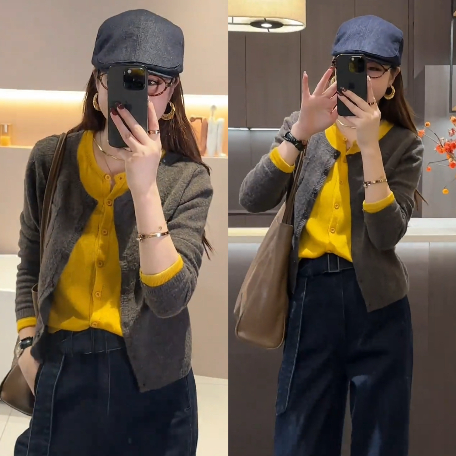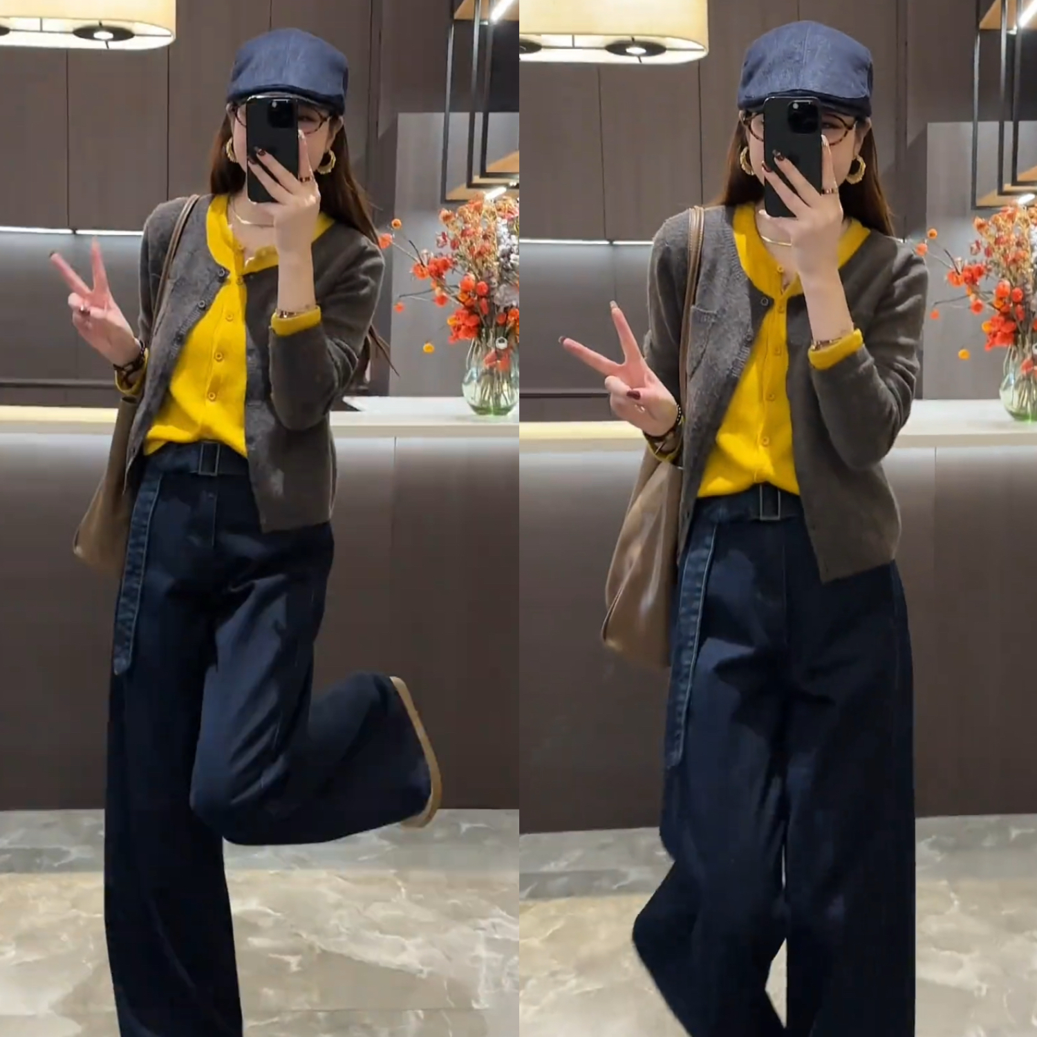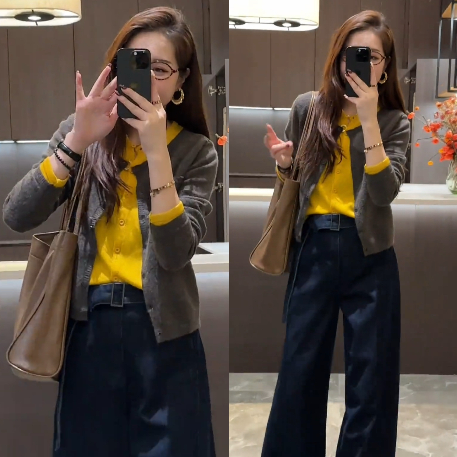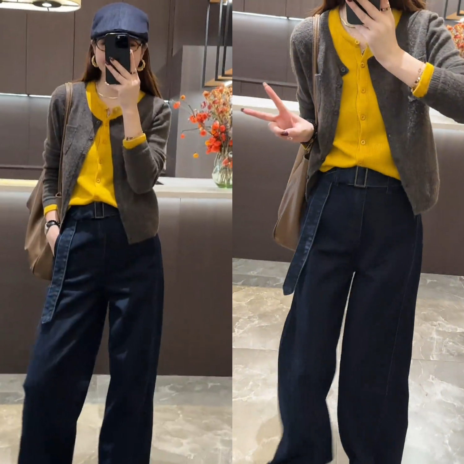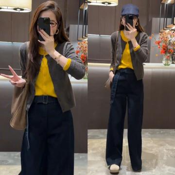 FA50186# 秋冬慵懒拼接假两件针织毛衣开衫+韩版时髦普洗直筒阔腿牛仔 服裝批發女裝批發服飾貨源