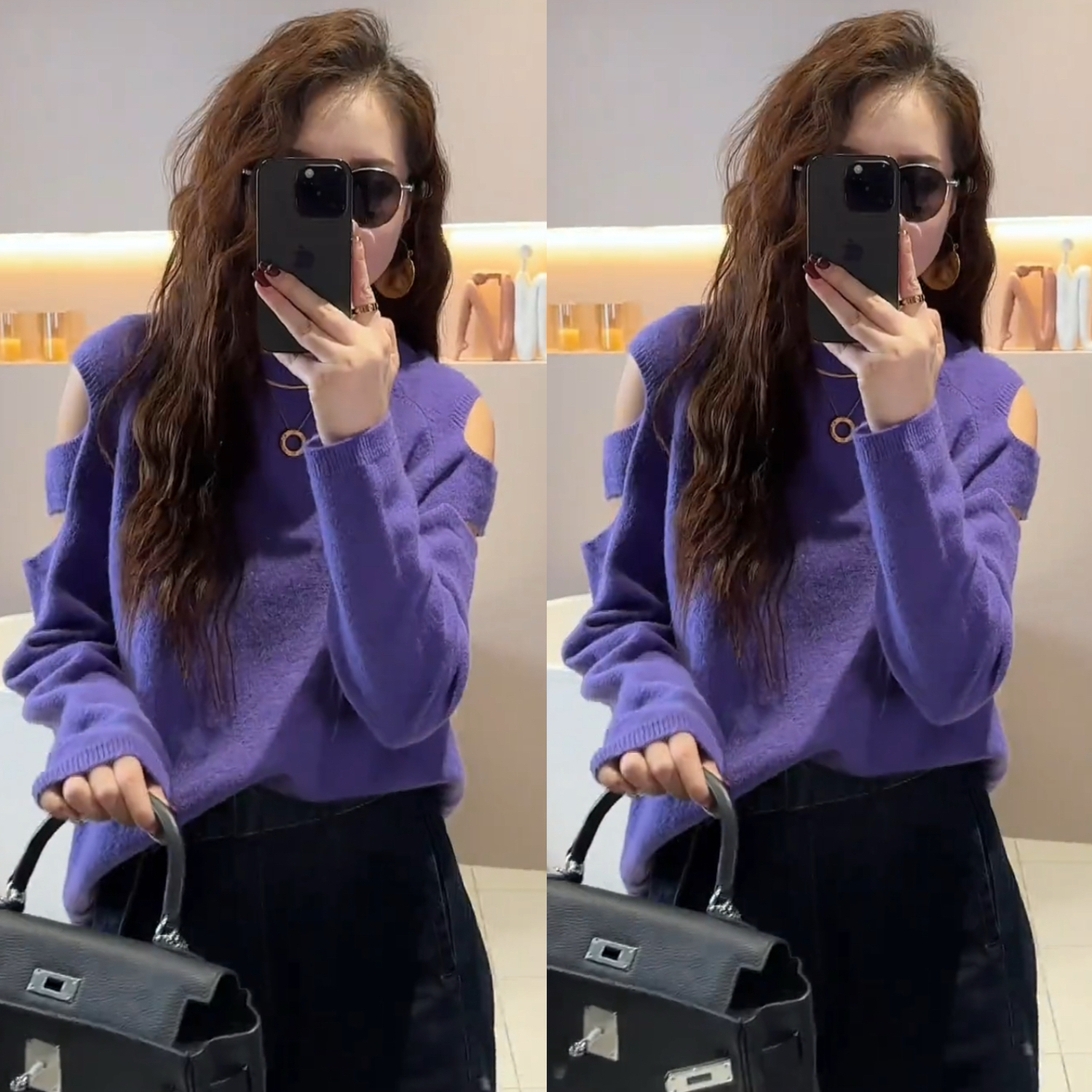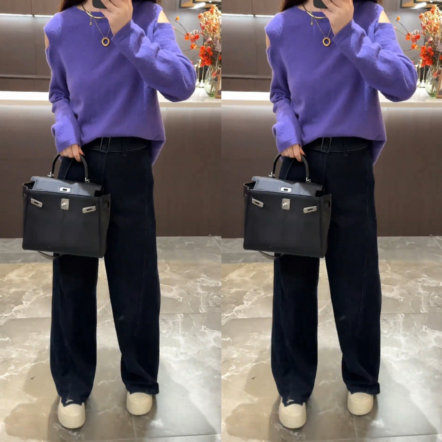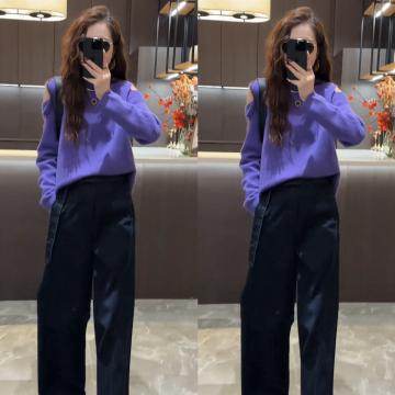 FA50188# 秋季新款百搭露肩设计款圆领针织衫上衣+普洗直筒阔腿牛仔 服裝批發女裝批發服飾貨源