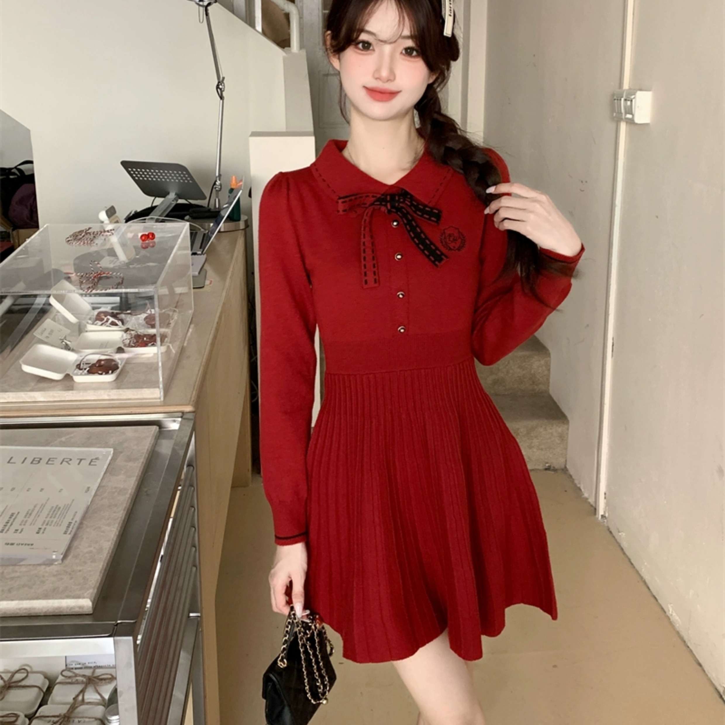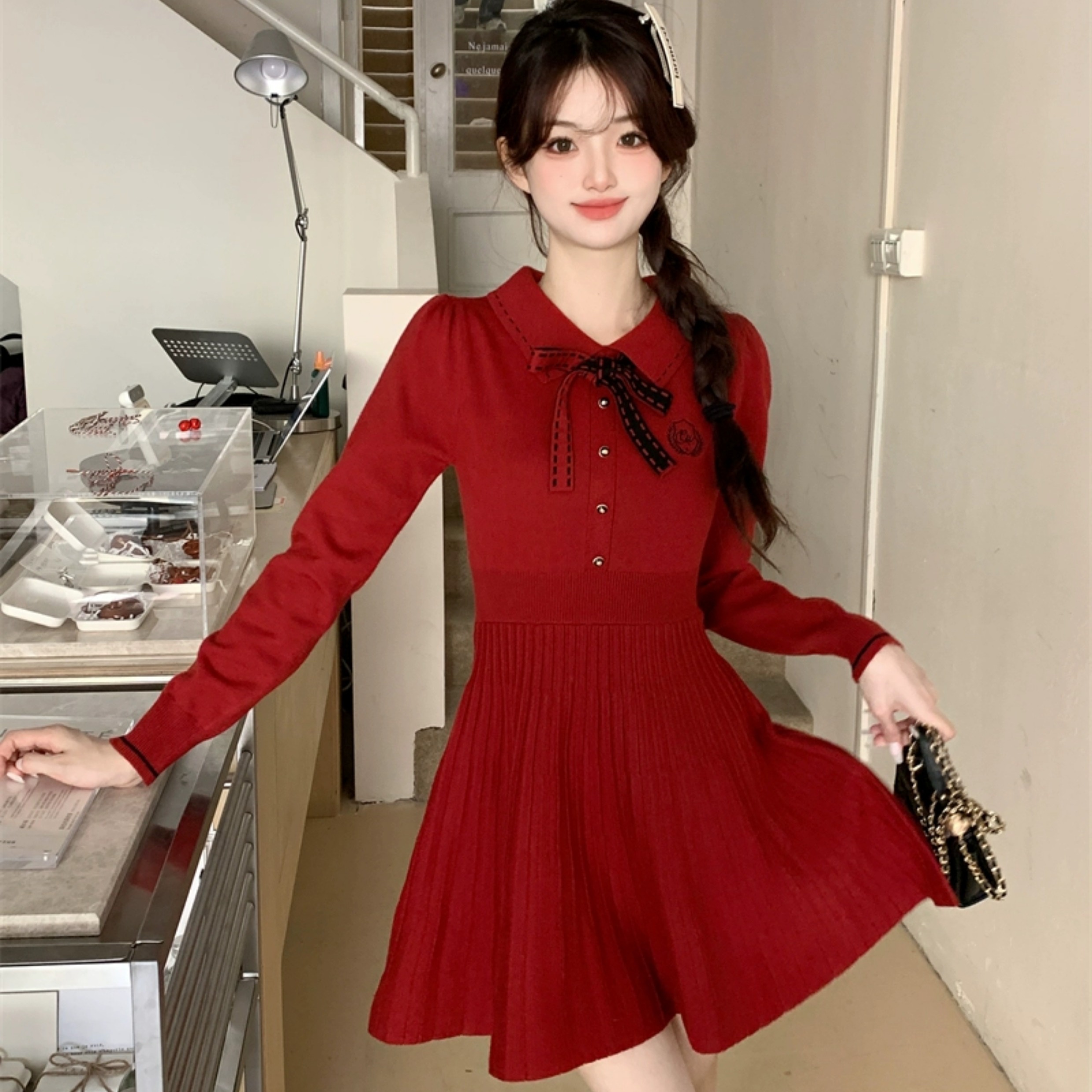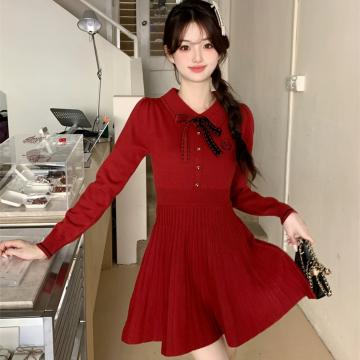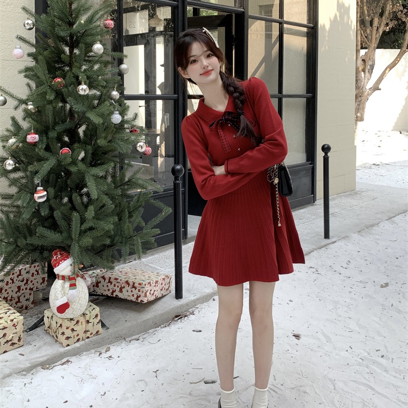 FA50285# 红色连衣裙女春秋冬法式小个子千金气质小香风内搭打底针织裙 服裝批發女裝批發服飾貨源