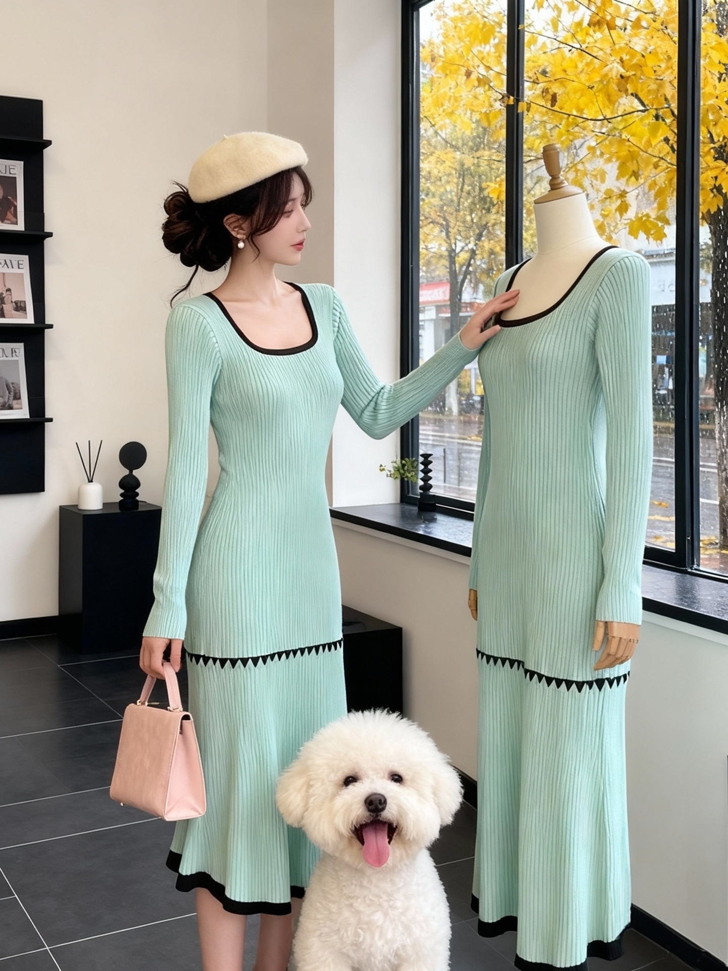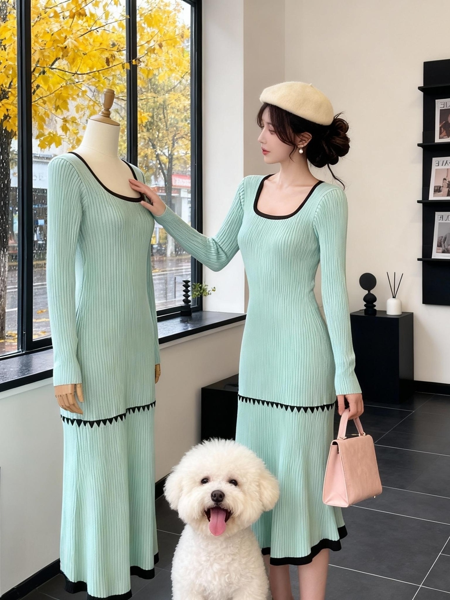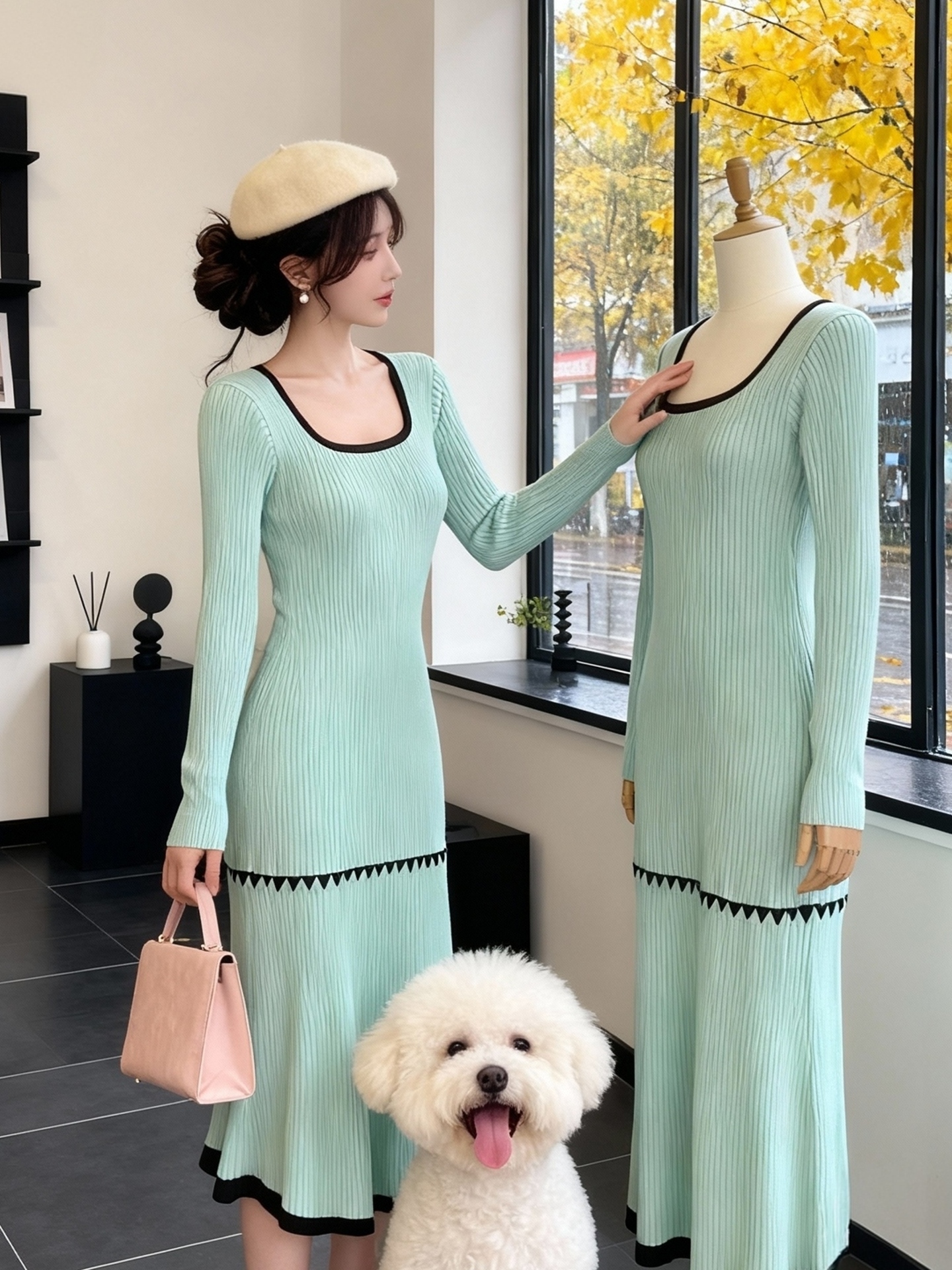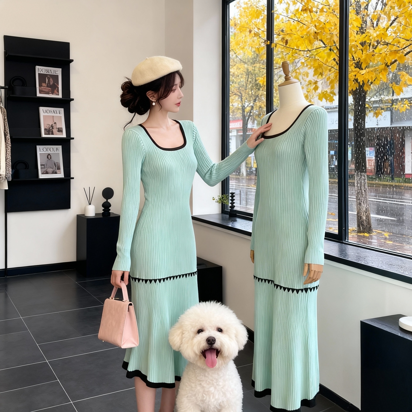 FA50291# 韩国轻熟简约风方领针织毛衣连衣裙女秋冬小香风内搭打底过膝长裙 服裝批發女裝批發服飾貨源