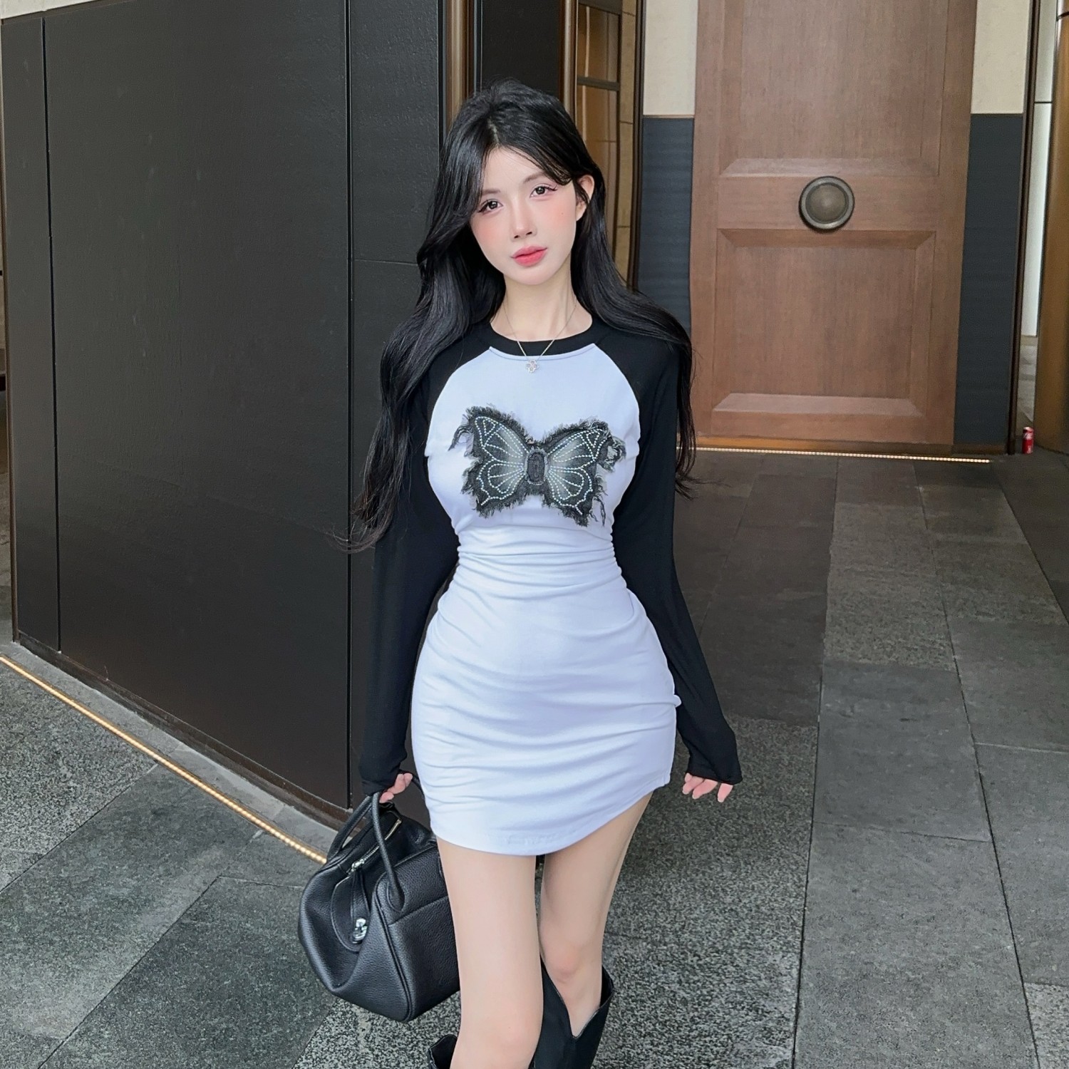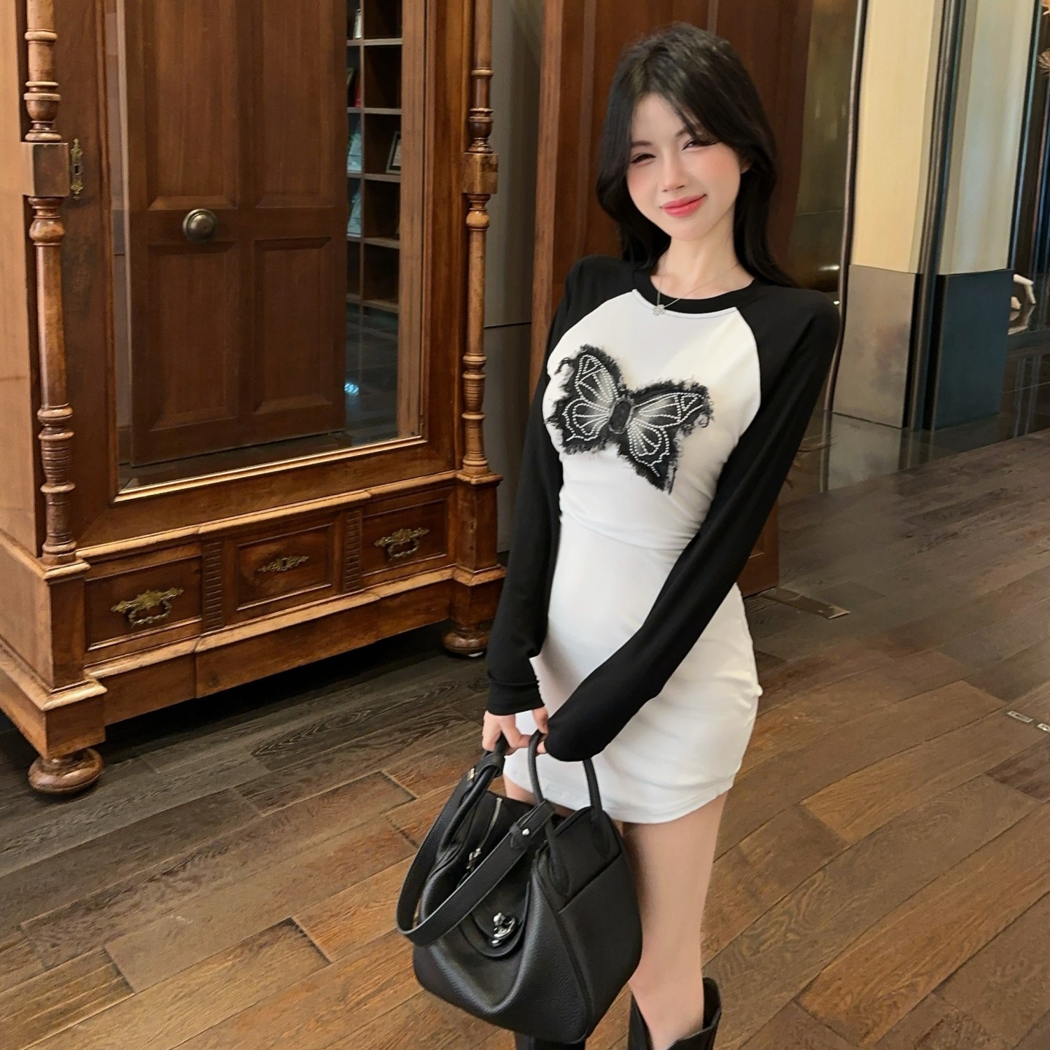 FA50310# 清仓时尚蝴蝶贴布长袖拼色辣妹连衣裙女 服裝批發女裝批發服飾貨源
