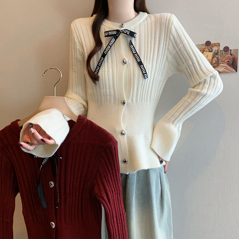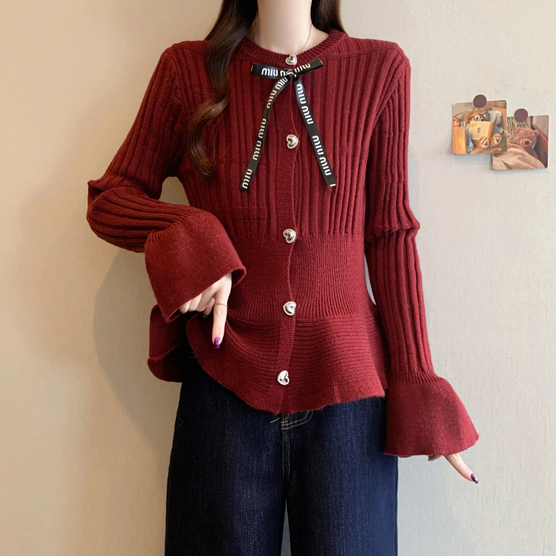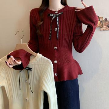 FA50312# 秋冬新款大码女小香风系带蝴蝶结荷叶边收腰显瘦针织上衣 服裝批發女裝批發服飾貨源