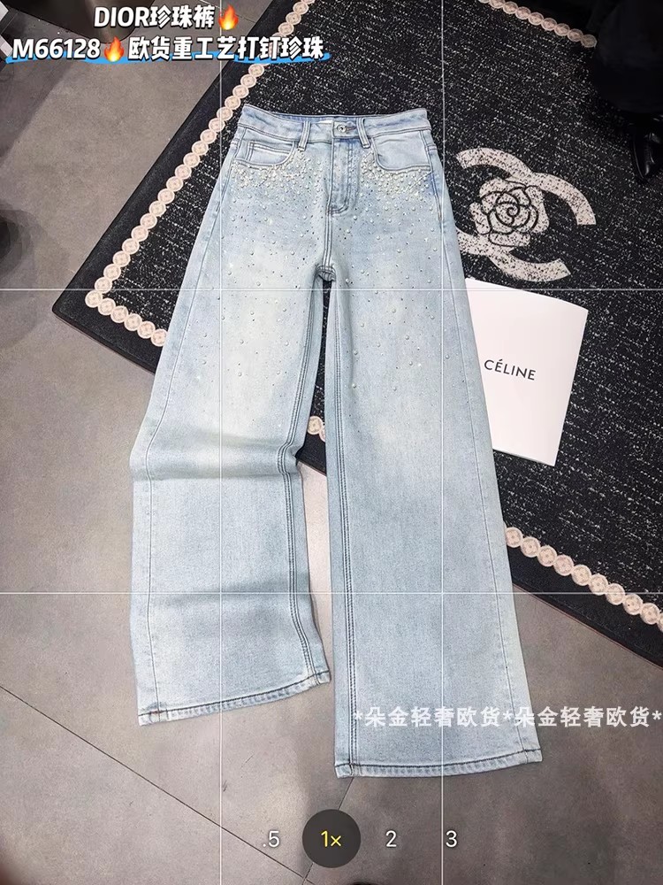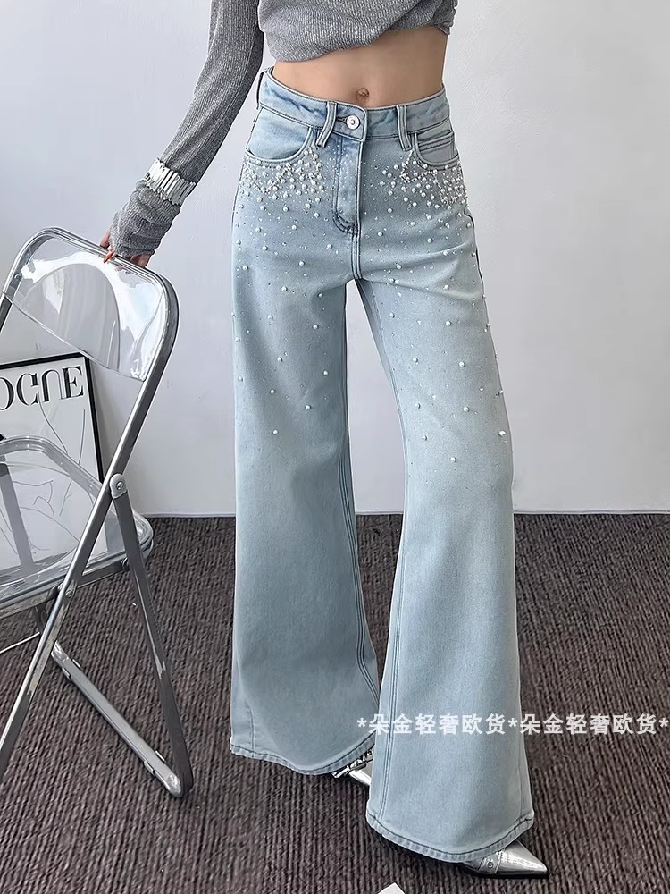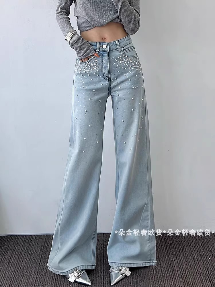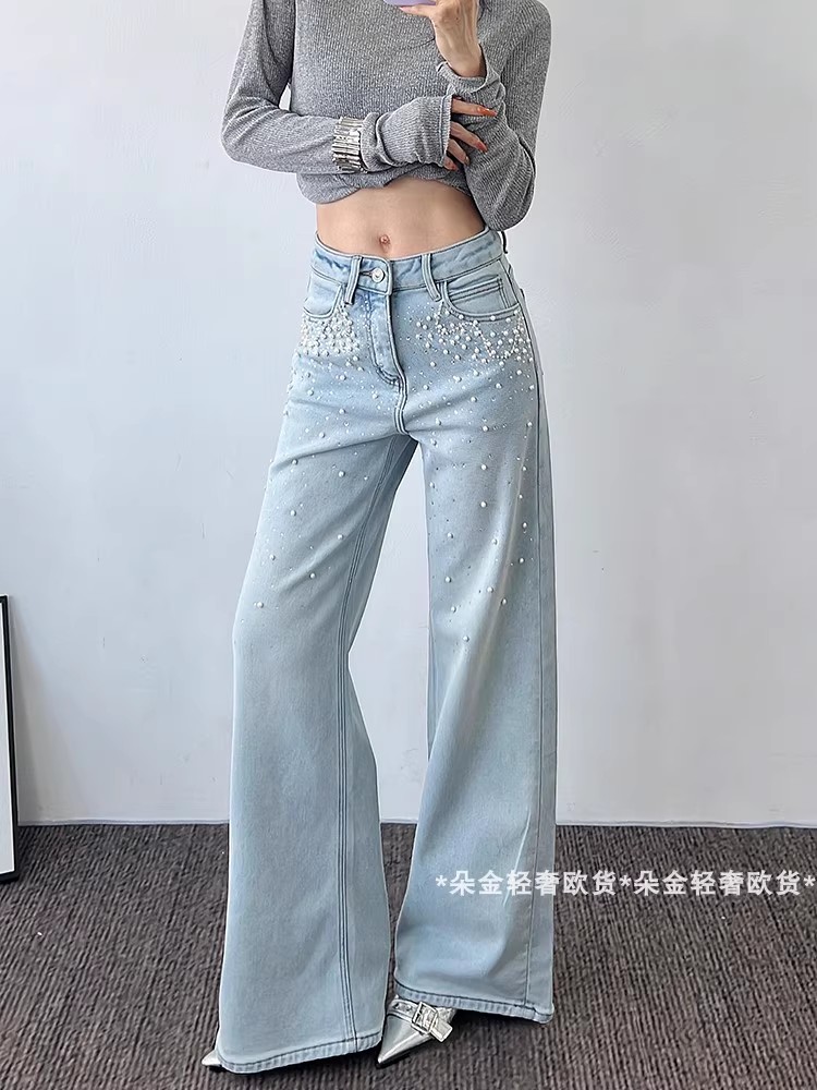 FA50323# 欧货新款轻奢时尚重工烫钻钉珠浅蓝气质直筒牛仔裤 服裝批發女裝批發服飾貨源