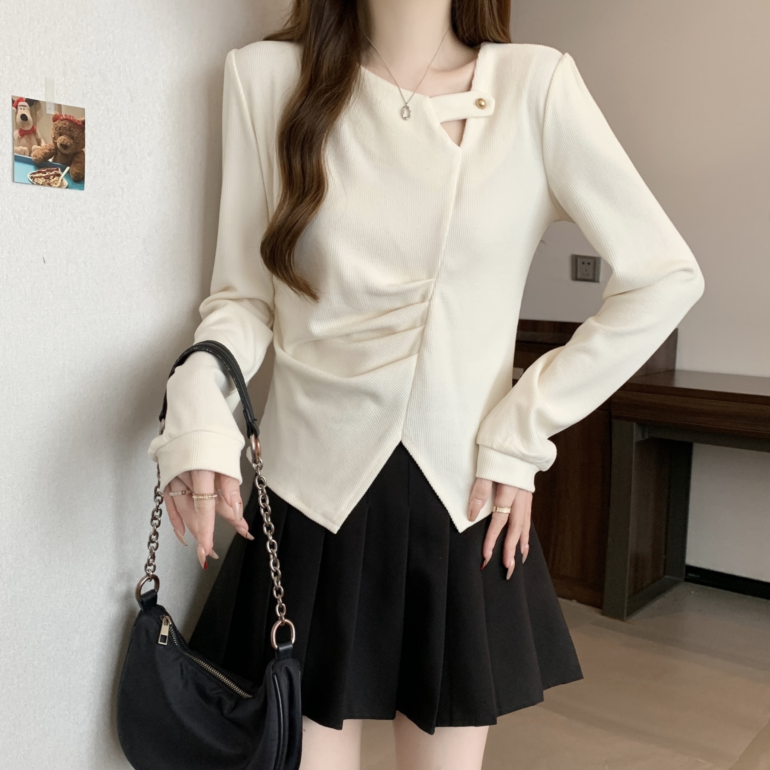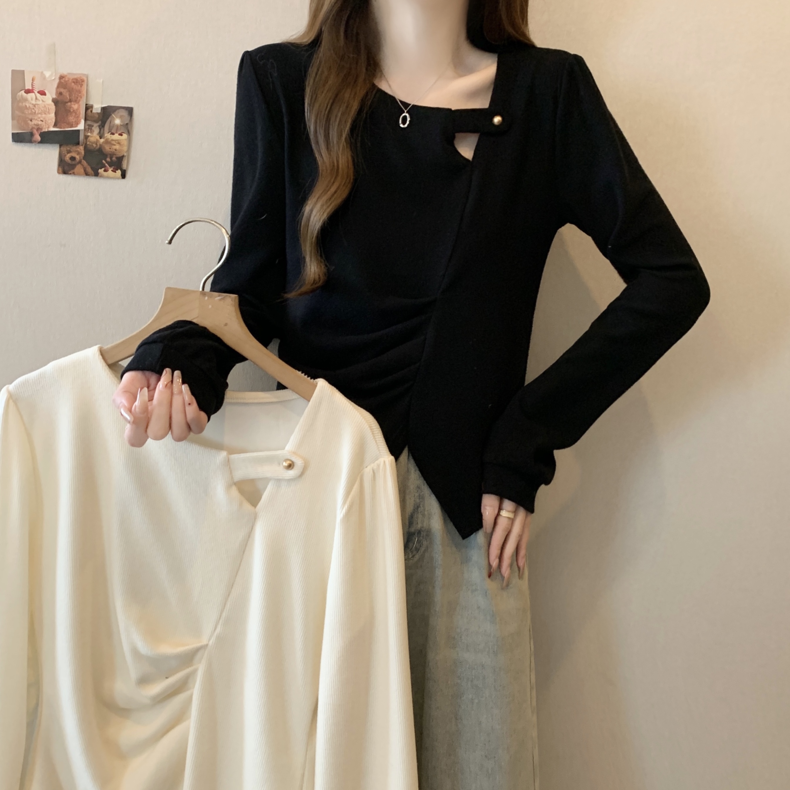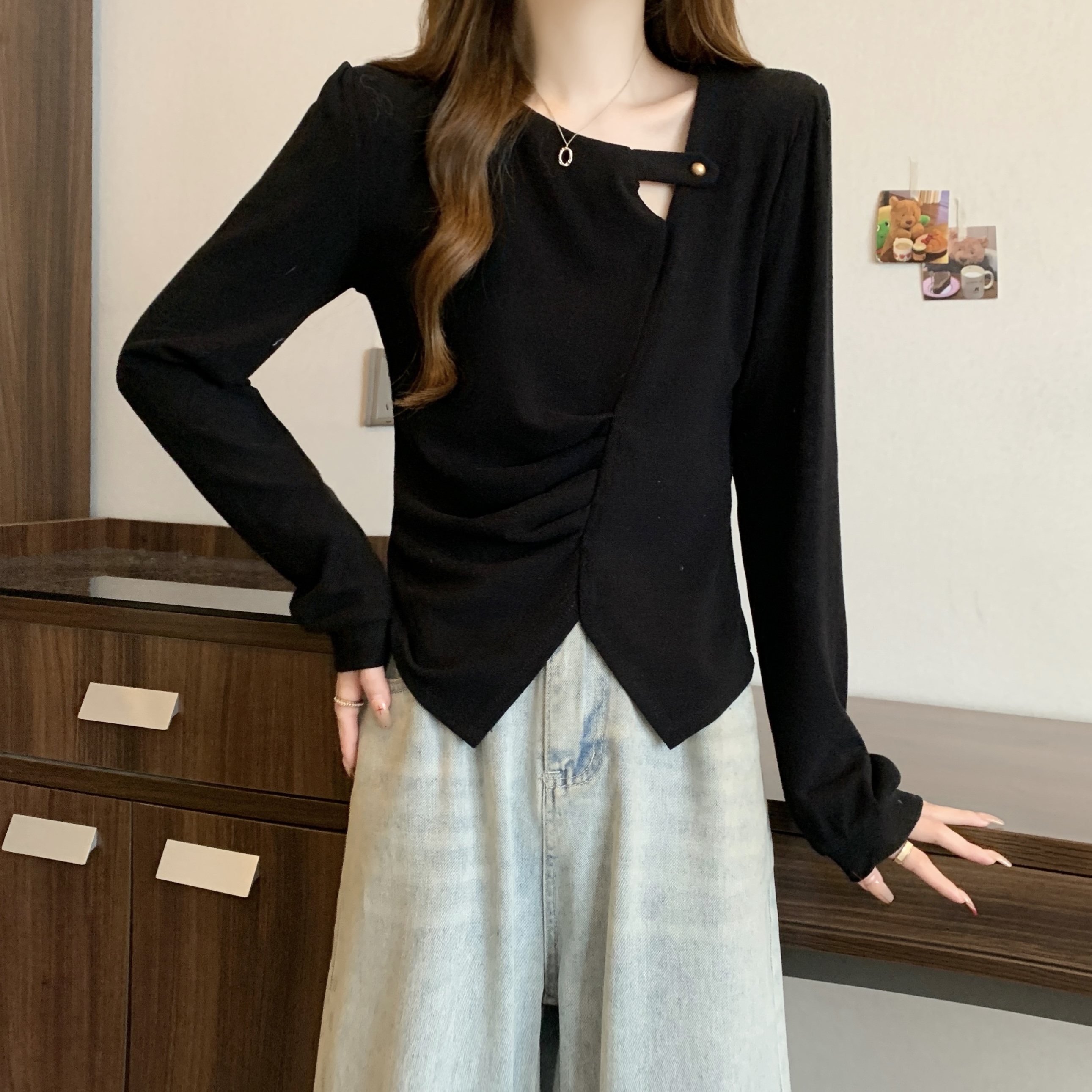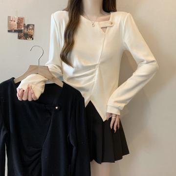 大码秋冬韩版胖MM设计感金属扣镂空褶皱下摆开叉遮肚显瘦长袖T恤 服裝批發女裝批發服飾貨源