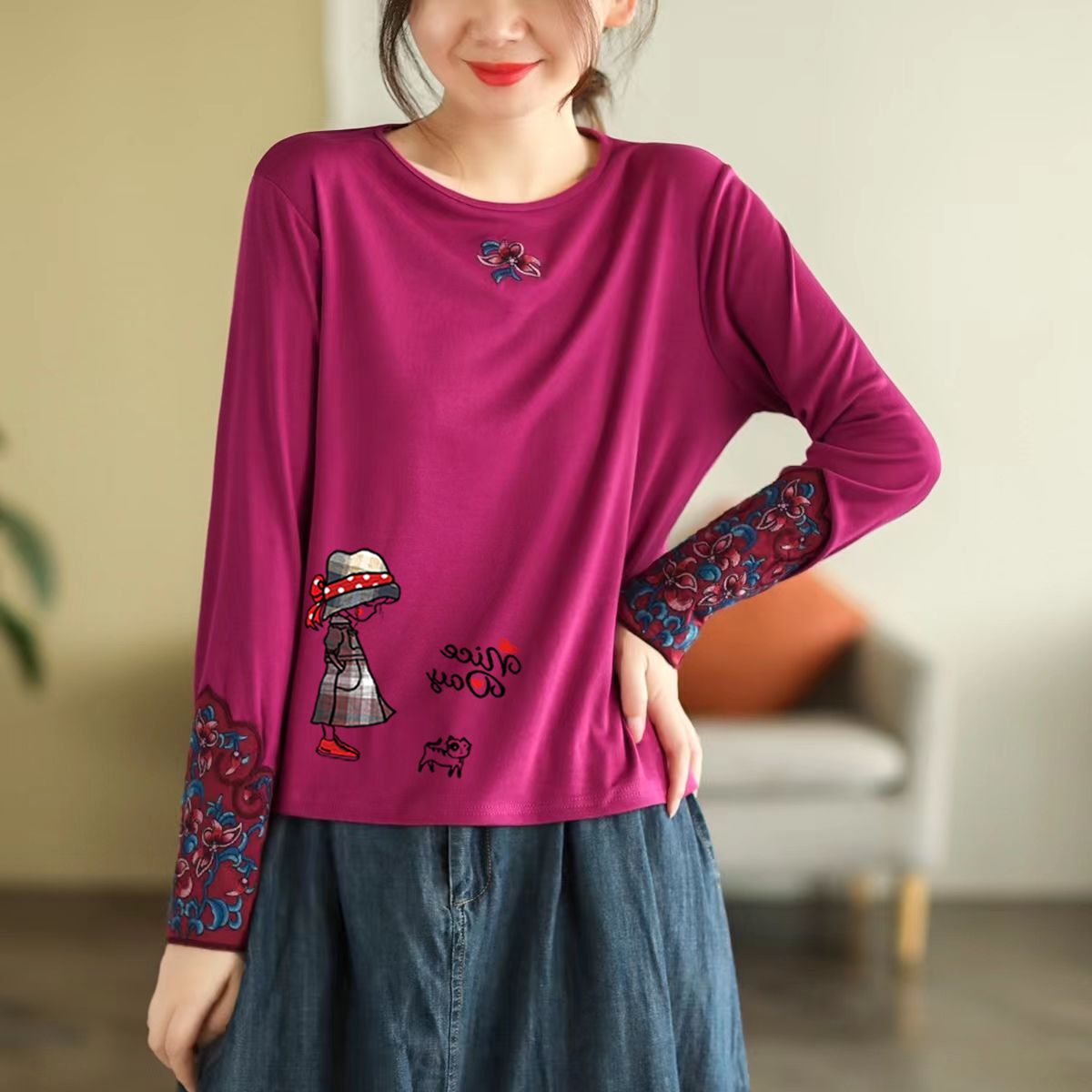 玫红色【小女孩遛狗图】