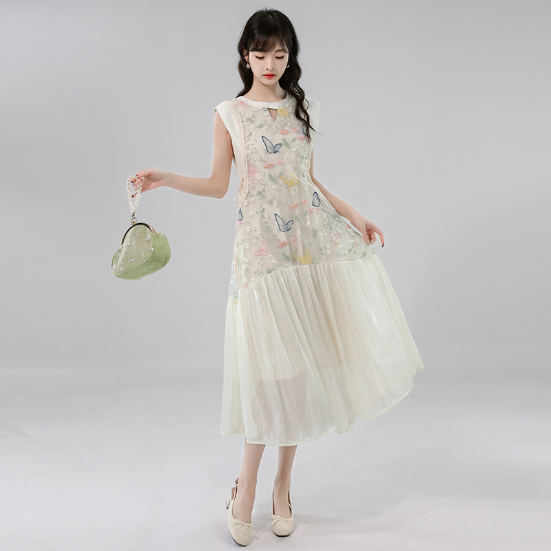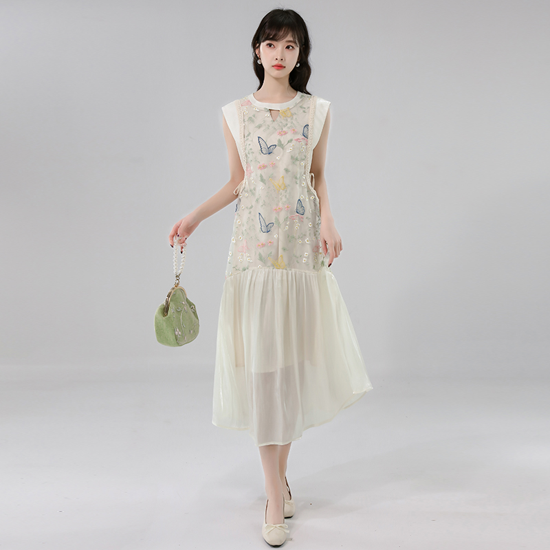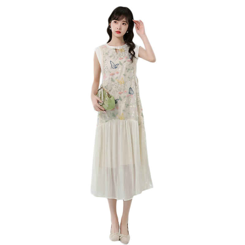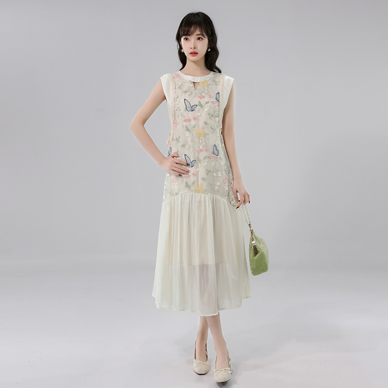 BY14244# 夏季新款国风蝴蝶刺绣重工设计拼接轻奢优雅无袖连衣裙 服裝批發女裝批發服飾貨源