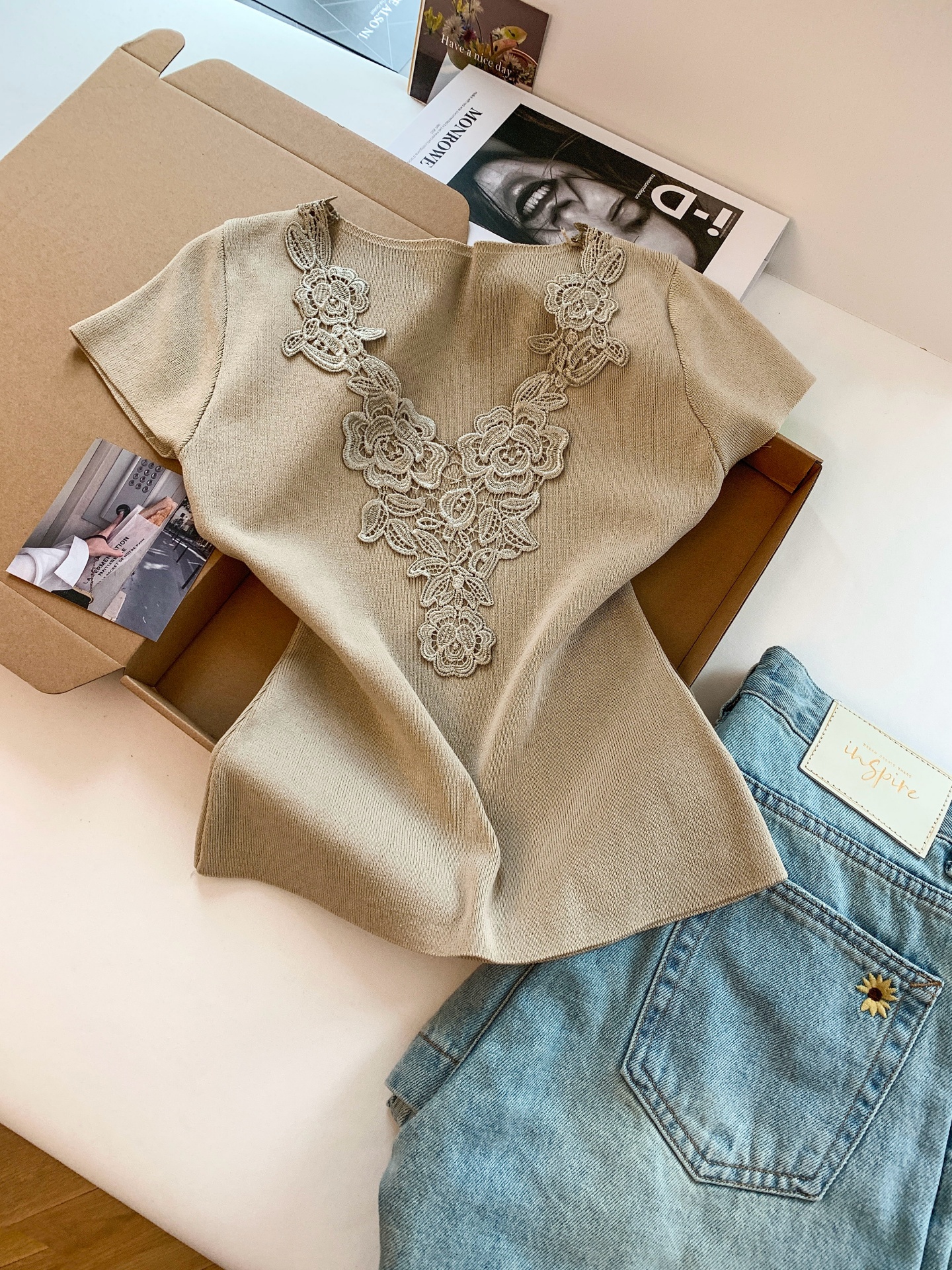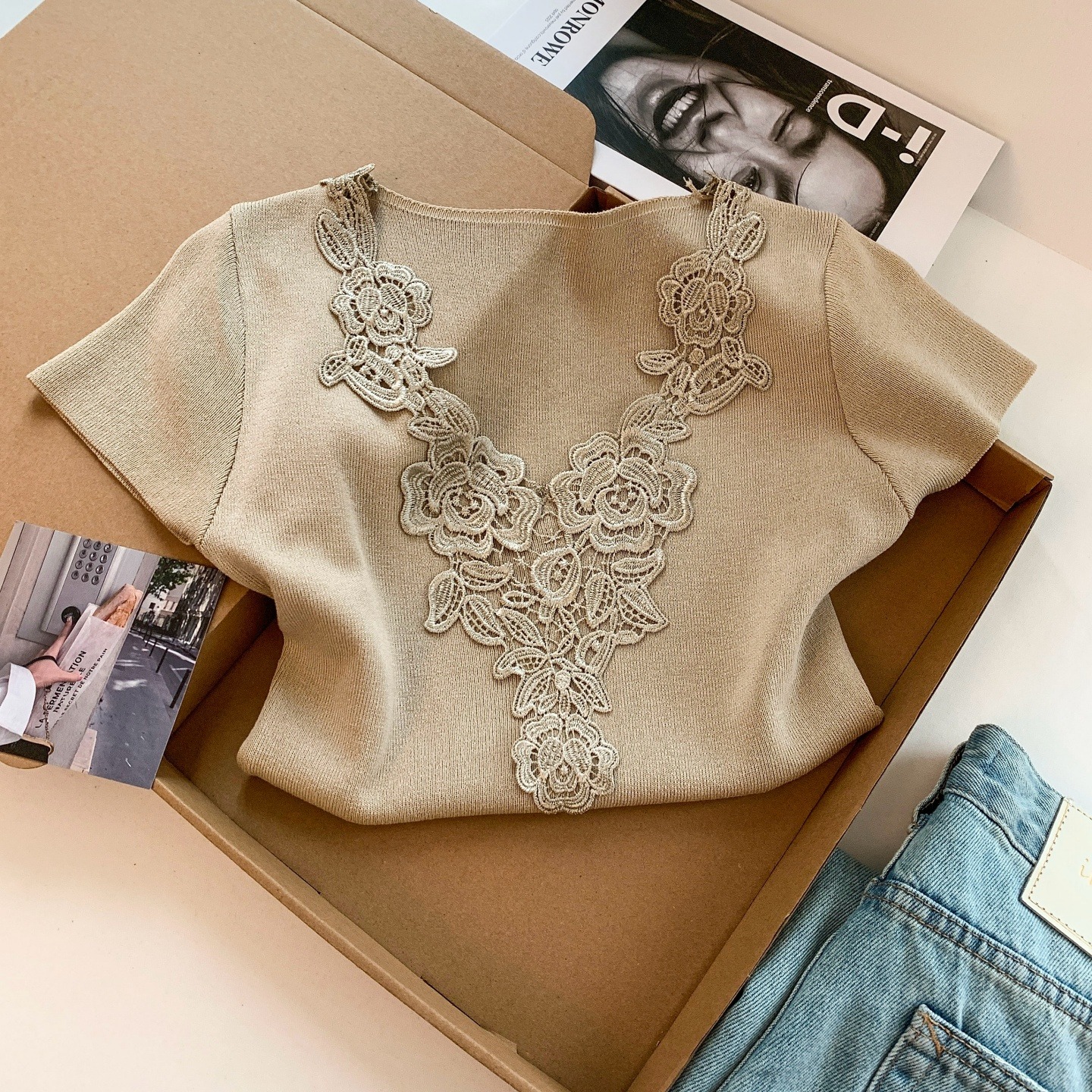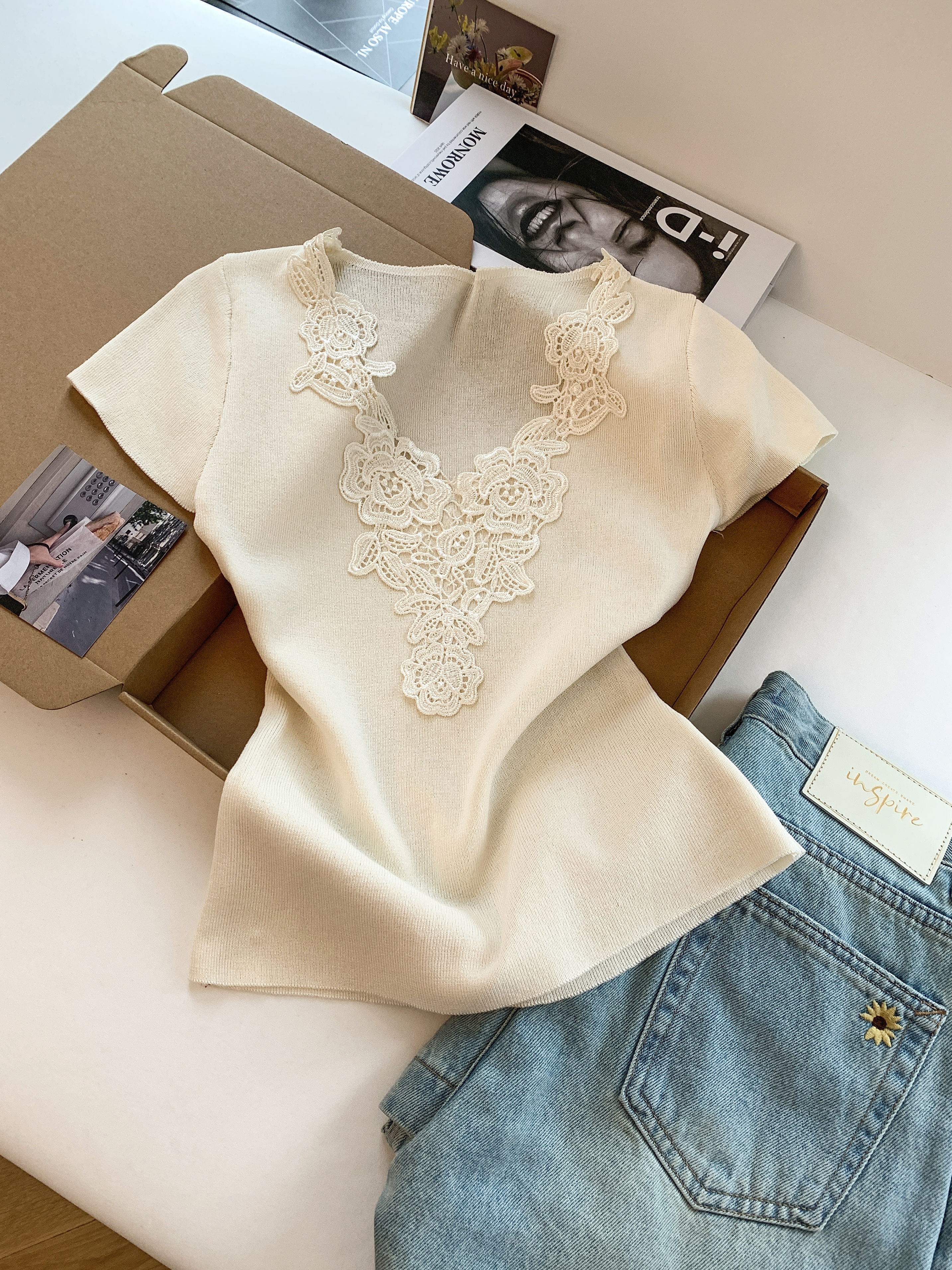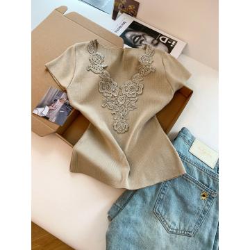 首页 > 毛衣、针织衫 > BY15093# 法式温柔风蕾丝拼接V领短袖针织衫女夏季甜美别致设计感上衣 服裝批發女裝批發服飾貨源