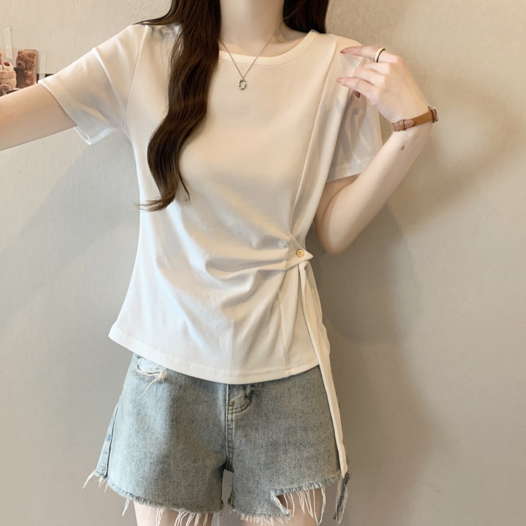 大码韩系设计感系带收腰短袖T恤女夏季新款圆领显瘦上衣 服裝批發女裝批發服飾貨源