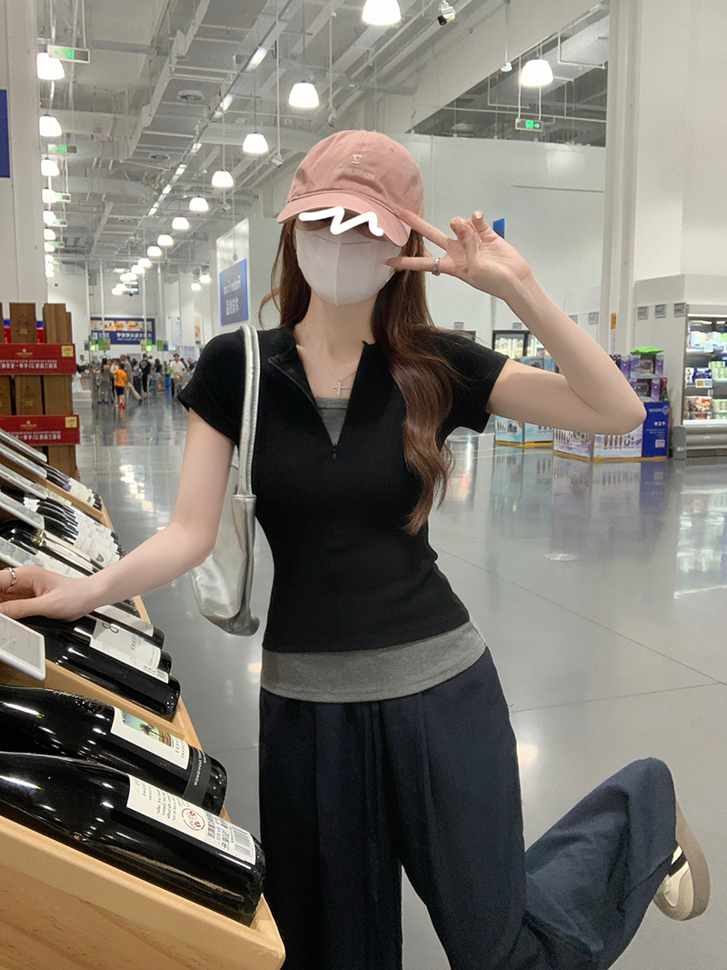 纯棉螺纹短袖t恤女装夏季新款纯色假两件拉链V领上衣 服裝批發女裝批發服飾貨源