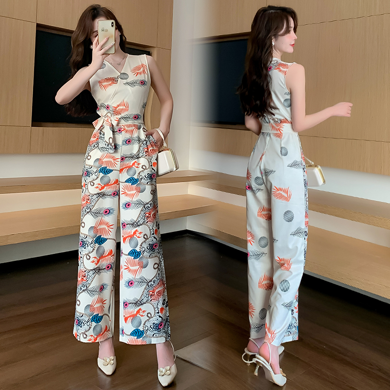 连体裤夏新款印花时尚洋气无袖收腰显瘦垂感阔腿裤 服裝批發女裝批發服飾貨源