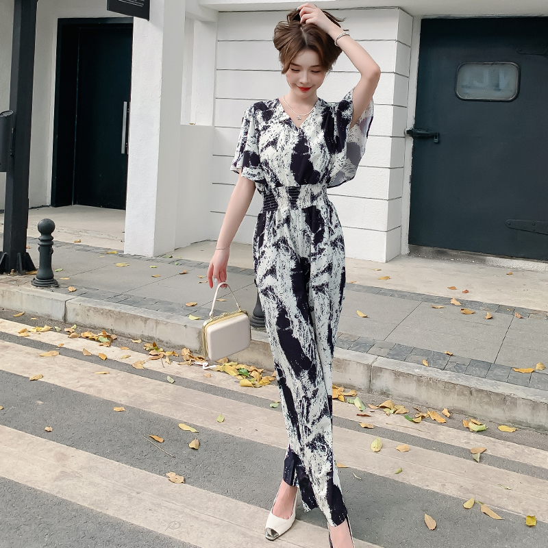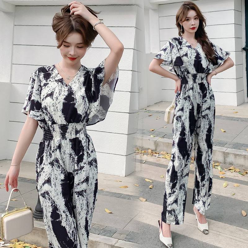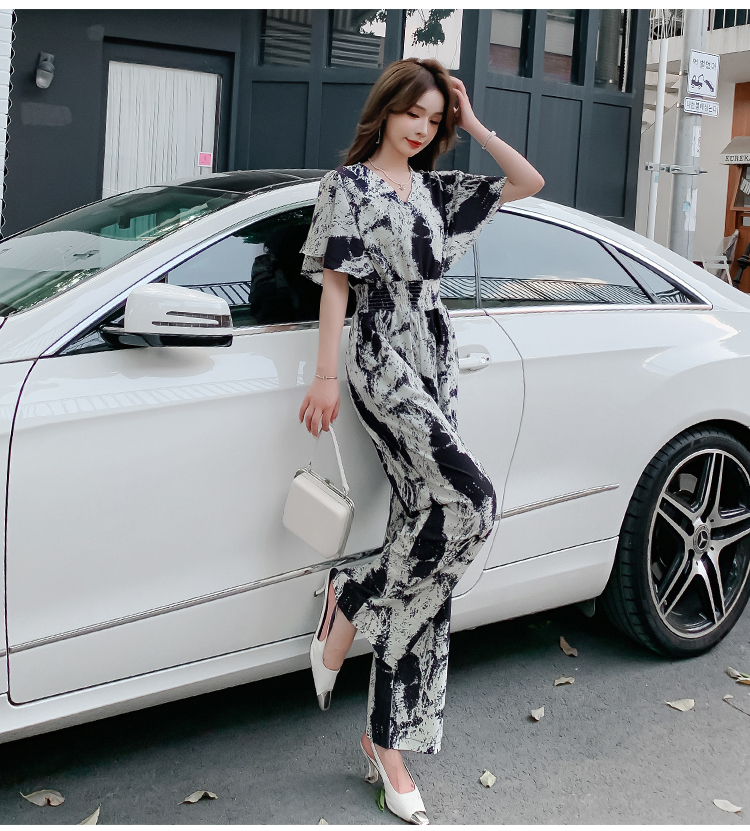 连体裤夏季水墨复古印花短袖v领薄款气质收腰显瘦连衣阔腿裤 服裝批發女裝批發服飾貨源