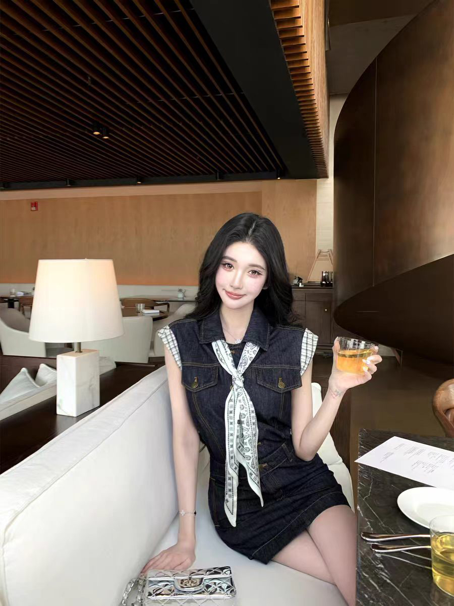 BarbChill单宁序章无袖牛仔连衣裙女夏季复古通勤a字短裙 服裝批發女裝批發服飾貨源