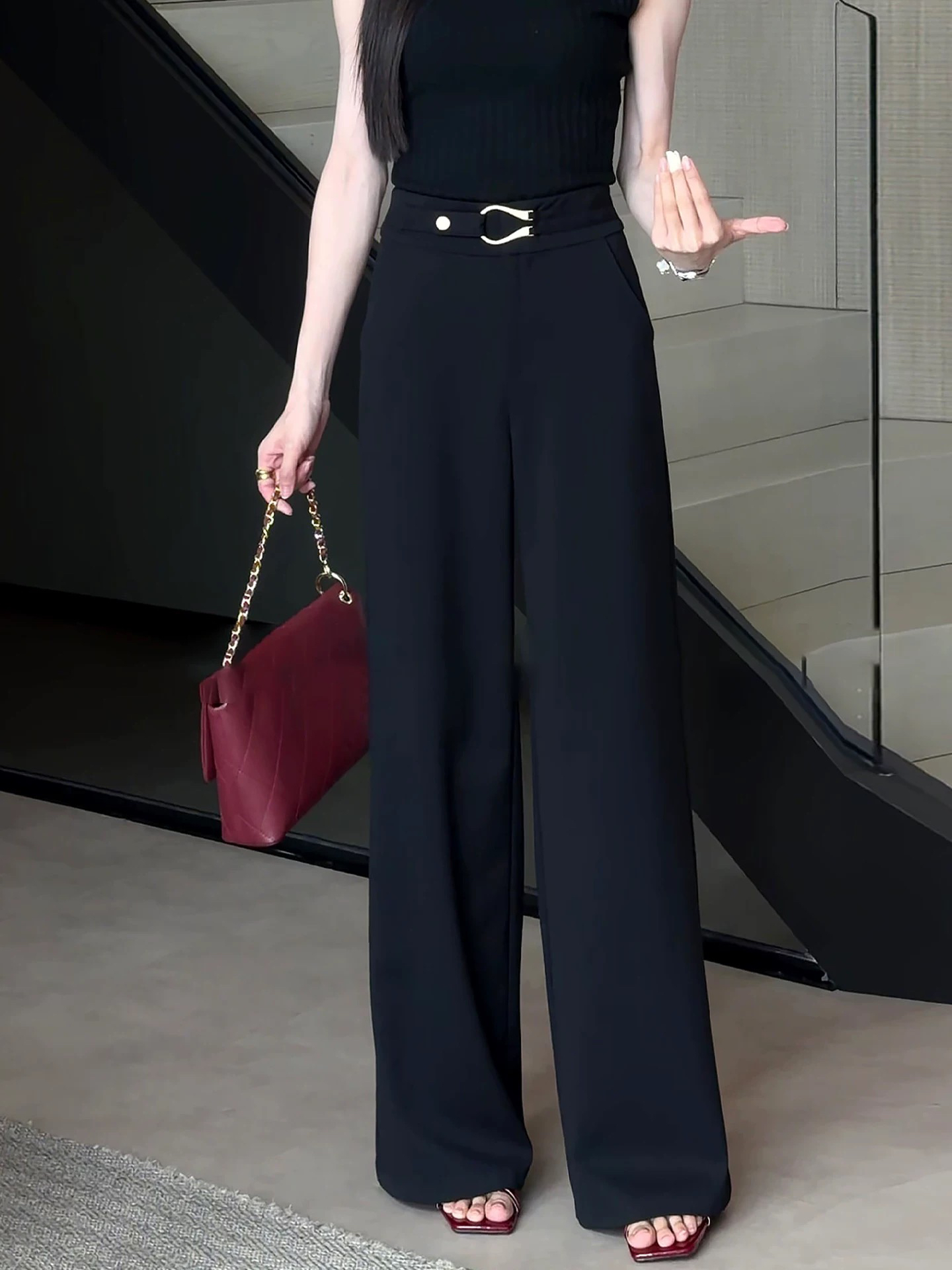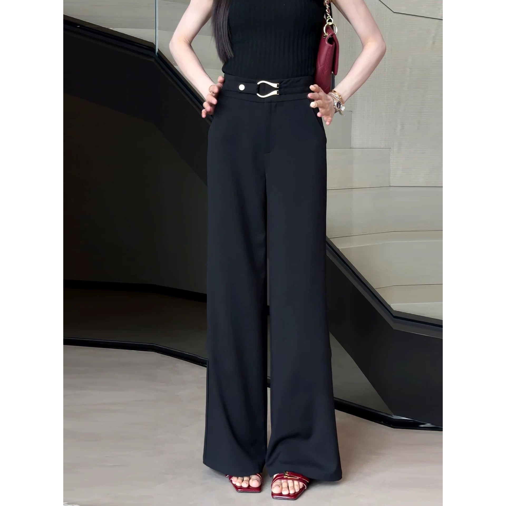 BY17900# 高级感黑色阔腿西装裤女夏薄款新款大码胖mm垂坠感显瘦拖地裤 服裝批發女裝批發服飾貨源