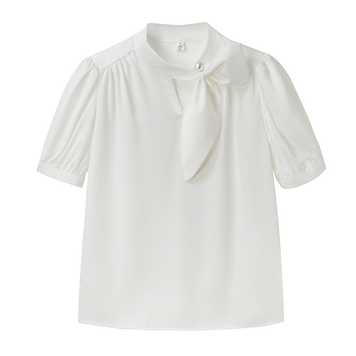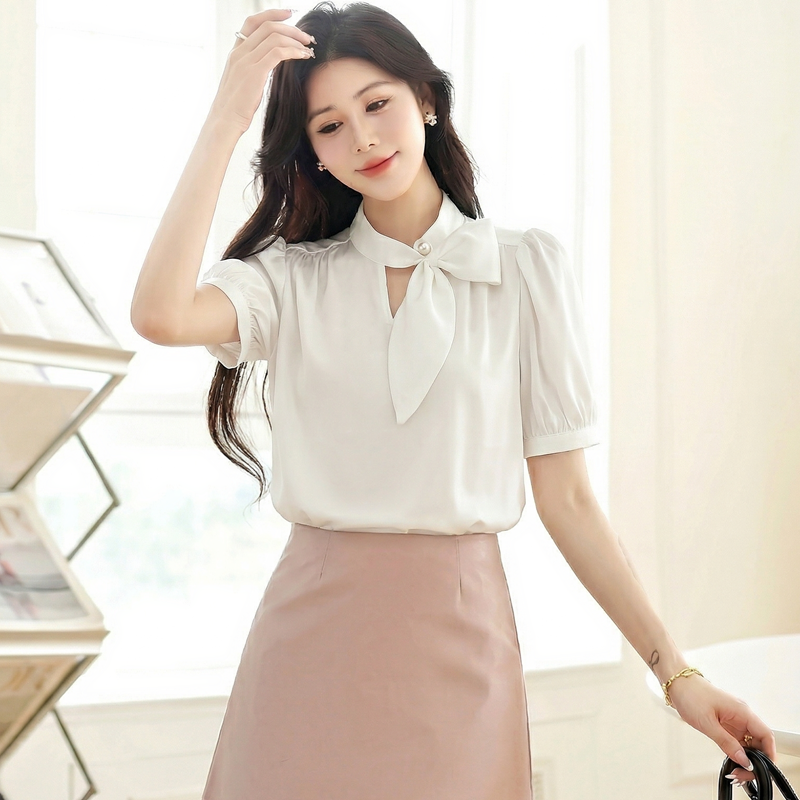 BY18643# 法式飘带白色缎面短袖衬衫女泡泡袖夏季新款通勤职业正装上衣 服裝批發女裝批發服飾貨源