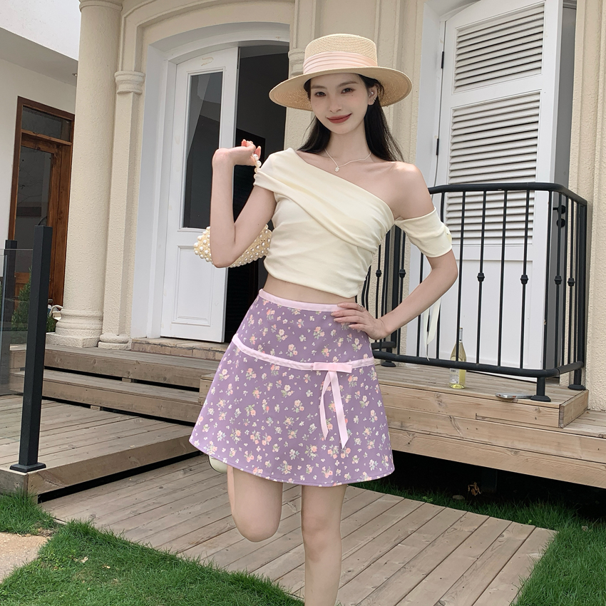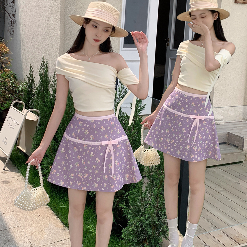 BY18717# 设计感半身裙女淡紫碎花短裙缎带蝴蝶结短款半身裙女A字裙 服裝批發女裝批發服飾貨源