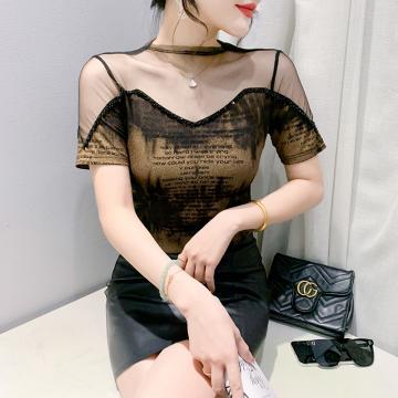 BY18746# 夏季新款V领镂空钉珠t恤女时尚网纱印花短袖修身显瘦潮 服裝批發女裝批發服飾貨源